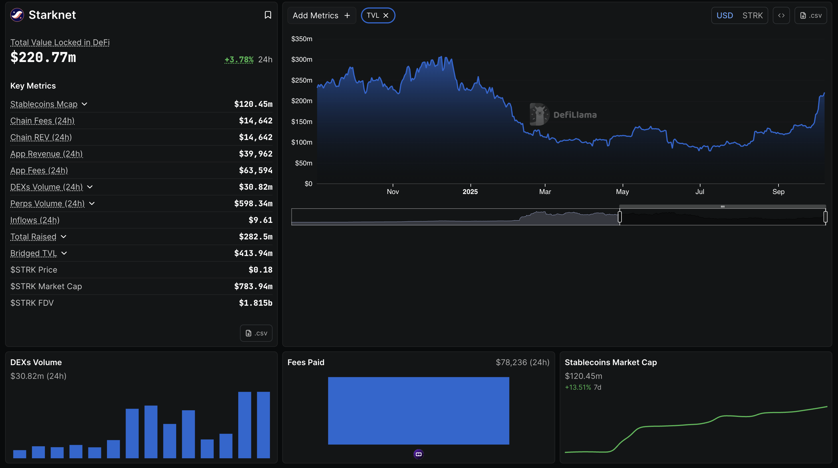 Starknet的总锁定价值(TVL)在过去24小时内增加了3.78%,达到2.2077亿美元,表明在网络上存入的数字资产增加。通常,TVL的上升意味着网络采用和用户信任的增加。