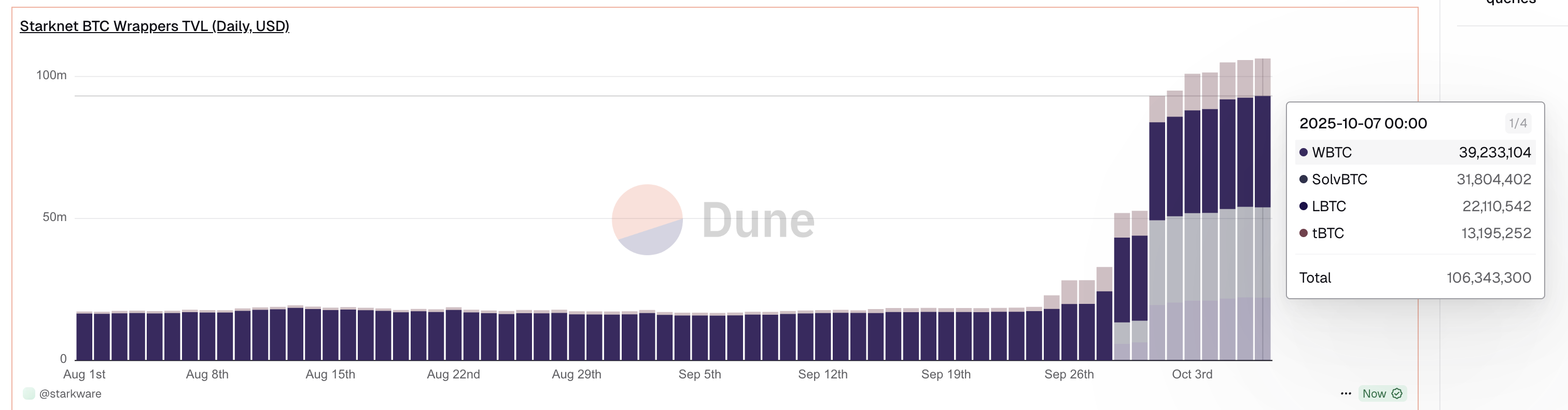 • Starknet上的比特币质押达到超过1.06亿美元的历史新高,受到上周宣布的BTCFi季节的推动。