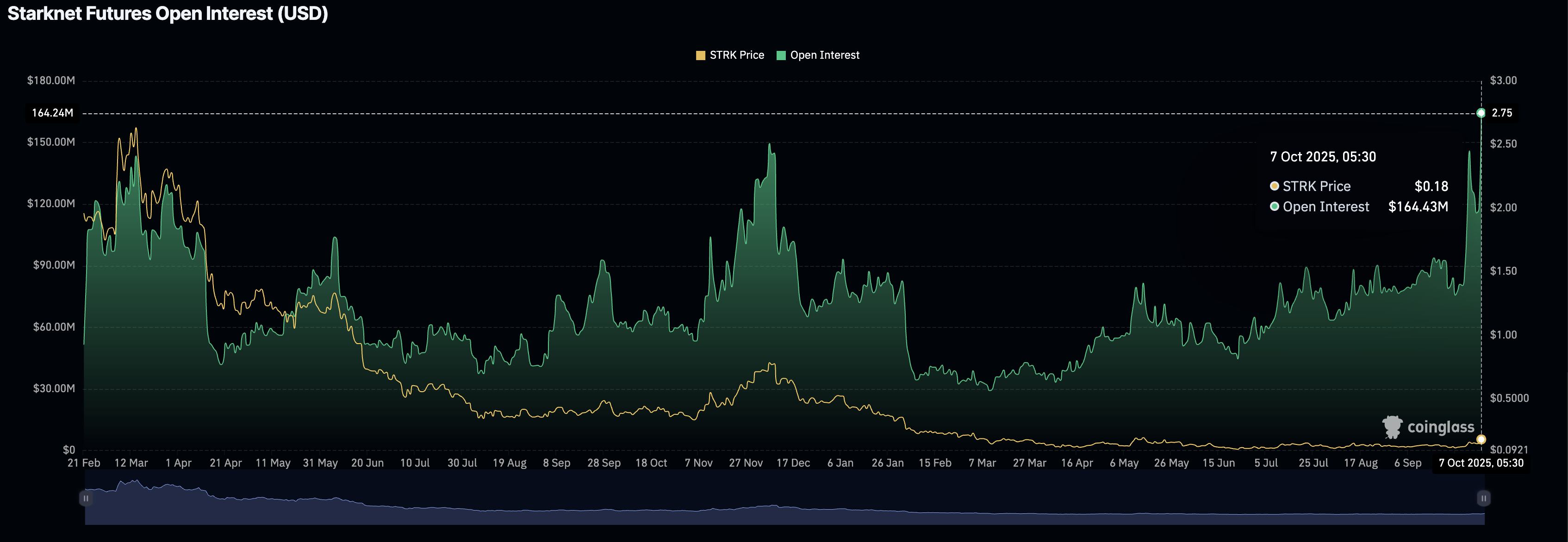 Starknet的零售需求持续增长,CoinGlass数据显示,STRK期货未平仓合约(OI)已达到1.6443亿美元的历史新高,较周一的1.1763亿美元有所上升。通常,期货OI的激增与衍生品交易者的风险偏好情绪上升相关,他们积累更大的多头头寸,预期进一步上涨。