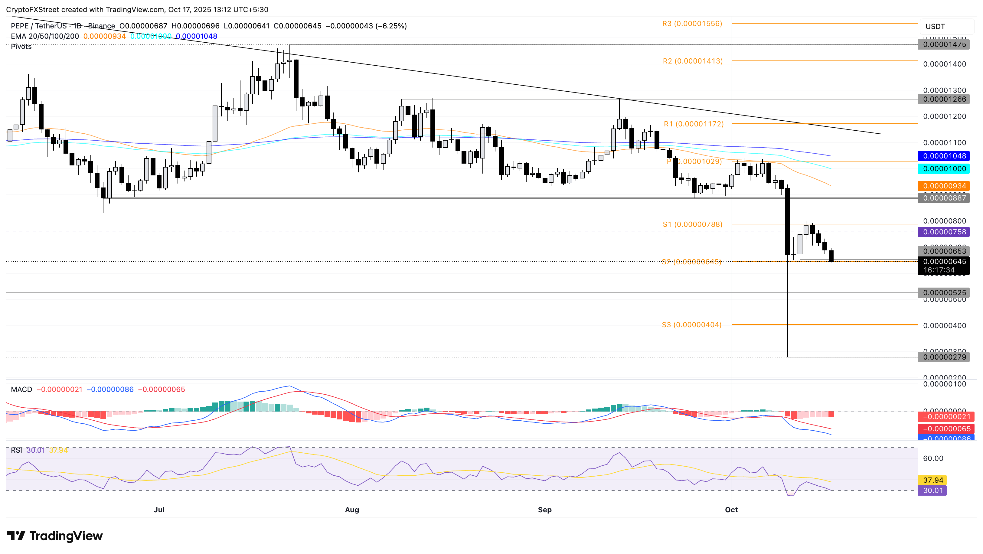 截至周五,Pepe价格下跌超过6%,面临看跌的周末。这个以青蛙为主题的表情包币正在测试0.00000645美元的S2支撑位,作为即时支撑位。