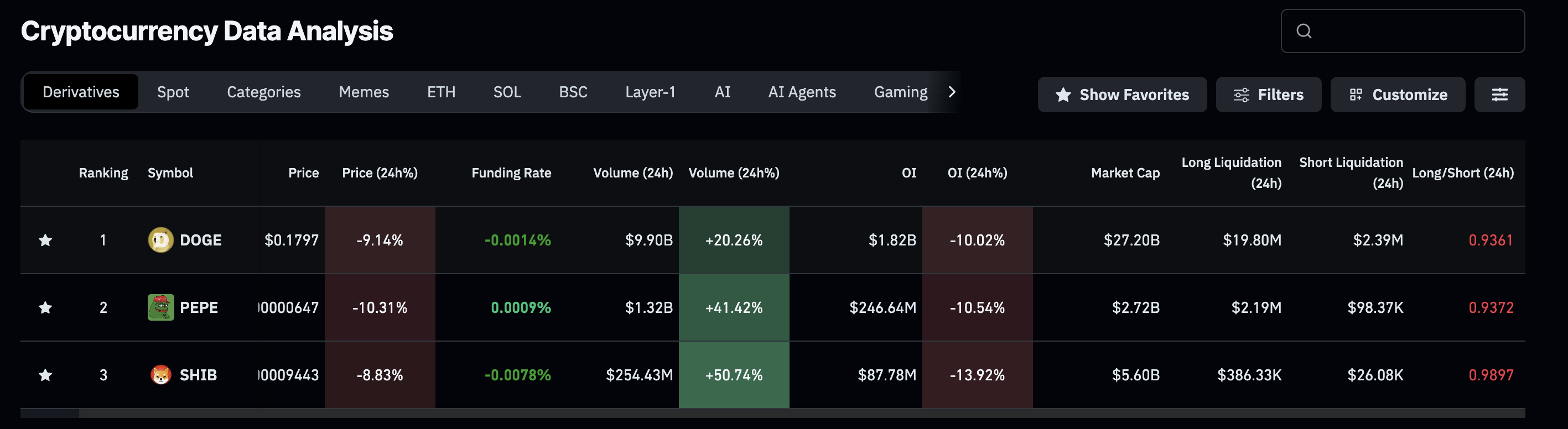 在更广泛的加密货币市场抛售的情况下,狗狗币、柴犬币和Pepe是首个失去零售兴趣的币种。在当前市场下行周期中,CoinGlass数据显示,DOGE、SHIB和PEPE的期货未平仓合约(OI)在过去24小时内下降了超过10%,分别达到18.2亿美元、8778万美元和2.4664亿美元。这一未平仓合约的下降表明,投资者的乐观情绪正在减弱,他们要么平仓多头头寸,要么去杠杆以减少风险敞口。