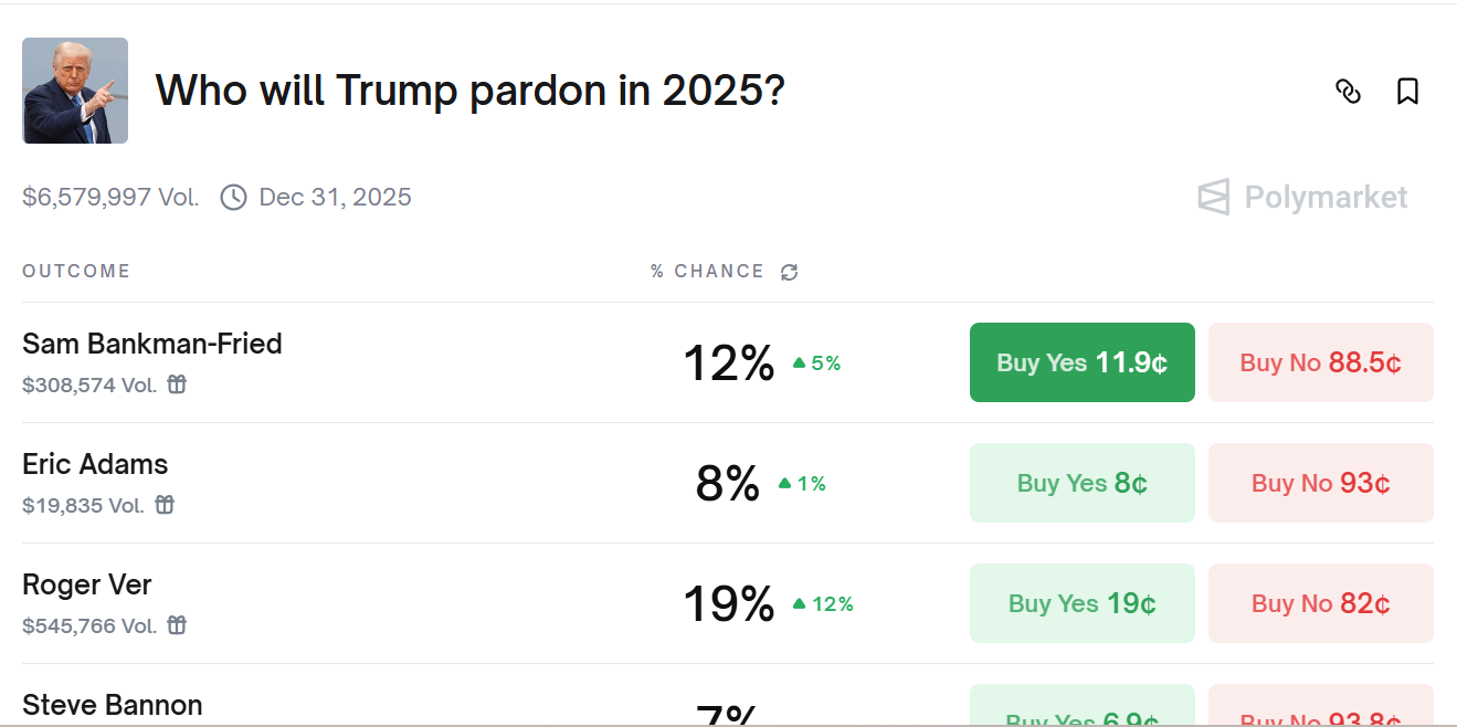 预测市场的交易者上调了对SBF被赦免的预期。在 Polymarket 上,相关合约的赦免概率上升了5个百分点至12%;而在 Kalshi 平台上,赦免概率更是跳涨9个百分点至16%。