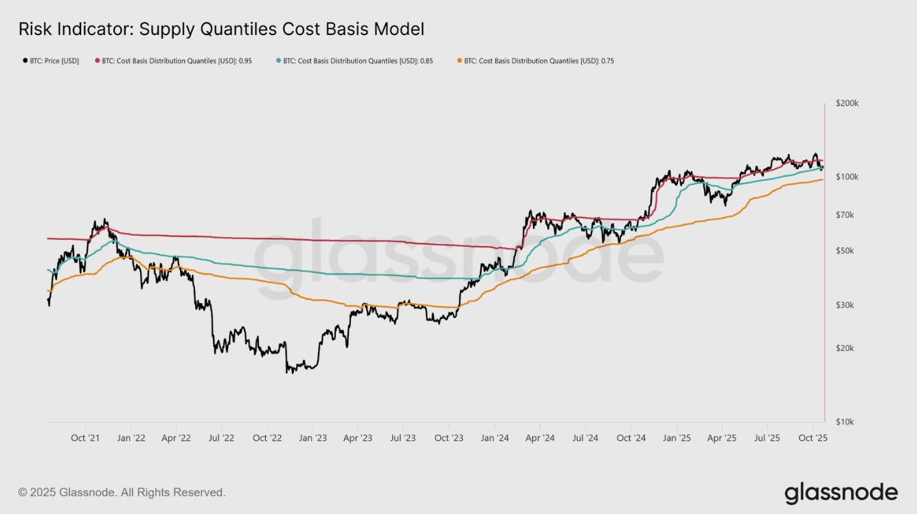 这种结构性疲软表明,比特币网络可能需要一个较长的盘整阶段来恢复市场信心。此外,如果 BTC 回调,可能会重新测试当前约为 97,500 美元的 0.75 分位数水平。
