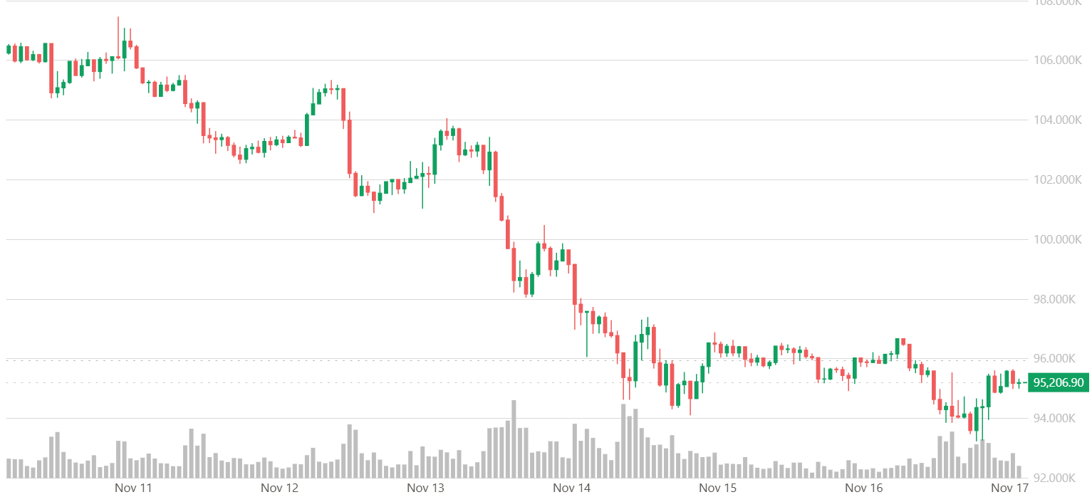 FX168财经报社(亚太)讯 在上周暴跌失守10万美元大关后,周一(11月17日)比特币继续低位整理,目前徘徊在9.5万美元附近,而加密市场整体情绪仍处于极度恐惧区间。
