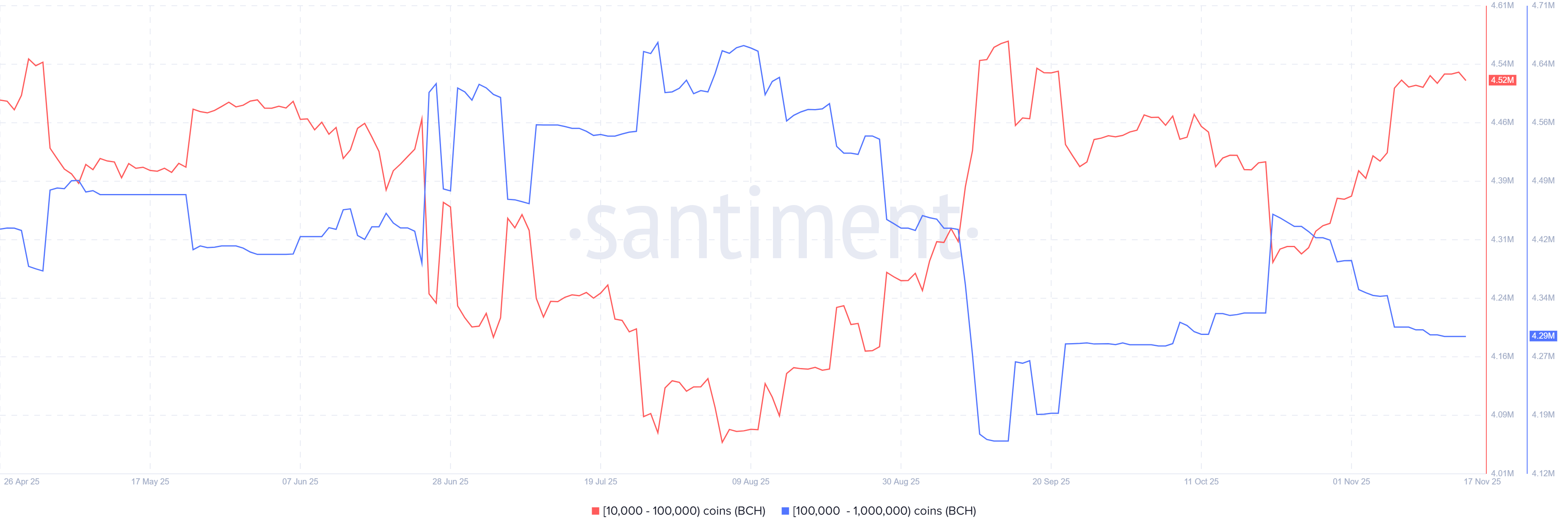 BCH供应分布进一步揭示了持有者的活动。持有10,000-100,000 BCH的投资者在过去一周内维持了450,000 BCH的集体持有量。自10月底恢复增持以来,他们的持有量在11月初稳步增加。