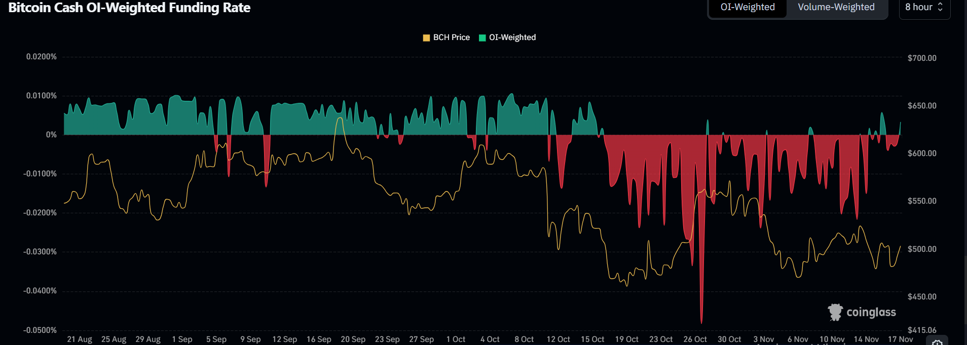 然而,比特币现金的衍生品数据显示出疲软的情绪。根据Coinglass的数据,自10月10日加密杠杆清洗以来,资金利率大多为负。