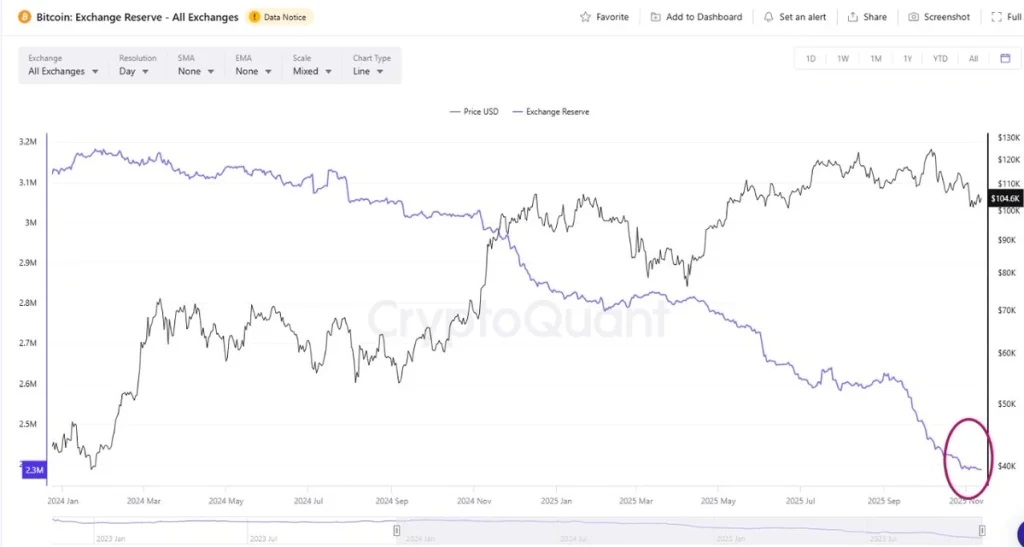 根据CryptoQuant的市场数据,中心化交易所中的比特币供应量已降至多年低点。