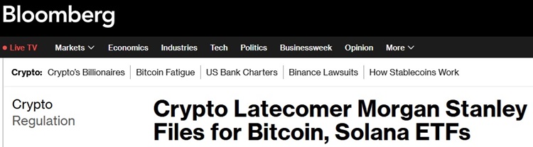 FX168财经报社(亚太)讯 美国彭博社周二(1月6日)报道称,摩根士丹利(Morgan Stanley)提交了比特币和索拉纳交易所交易基金(ETF)的申请,这标志着该华尔街巨头在加密货币ETF在美国爆发式增长并将其推向主流两年后,首次涉足基金领域的这一热门领域。