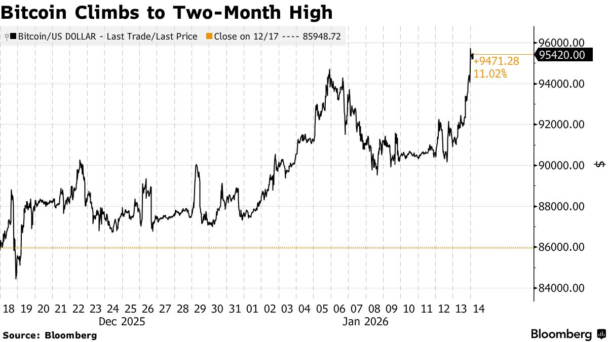 FX168财经报社(亚太)讯 周三(1月14日)亚洲交易时段,比特币延续1月以来的谨慎上行走势,并一度刷新近两个月高位至9.5万美元上方。在地缘政治不确定性升温、美国通胀数据偏温和以及美联储卷入司法部传票风波的背景下,“避险与硬资产”叙事对加密资产的边际吸引力有所增强。与此同时,衍生品市场出现明显空头挤压,进一步放大短线涨幅。