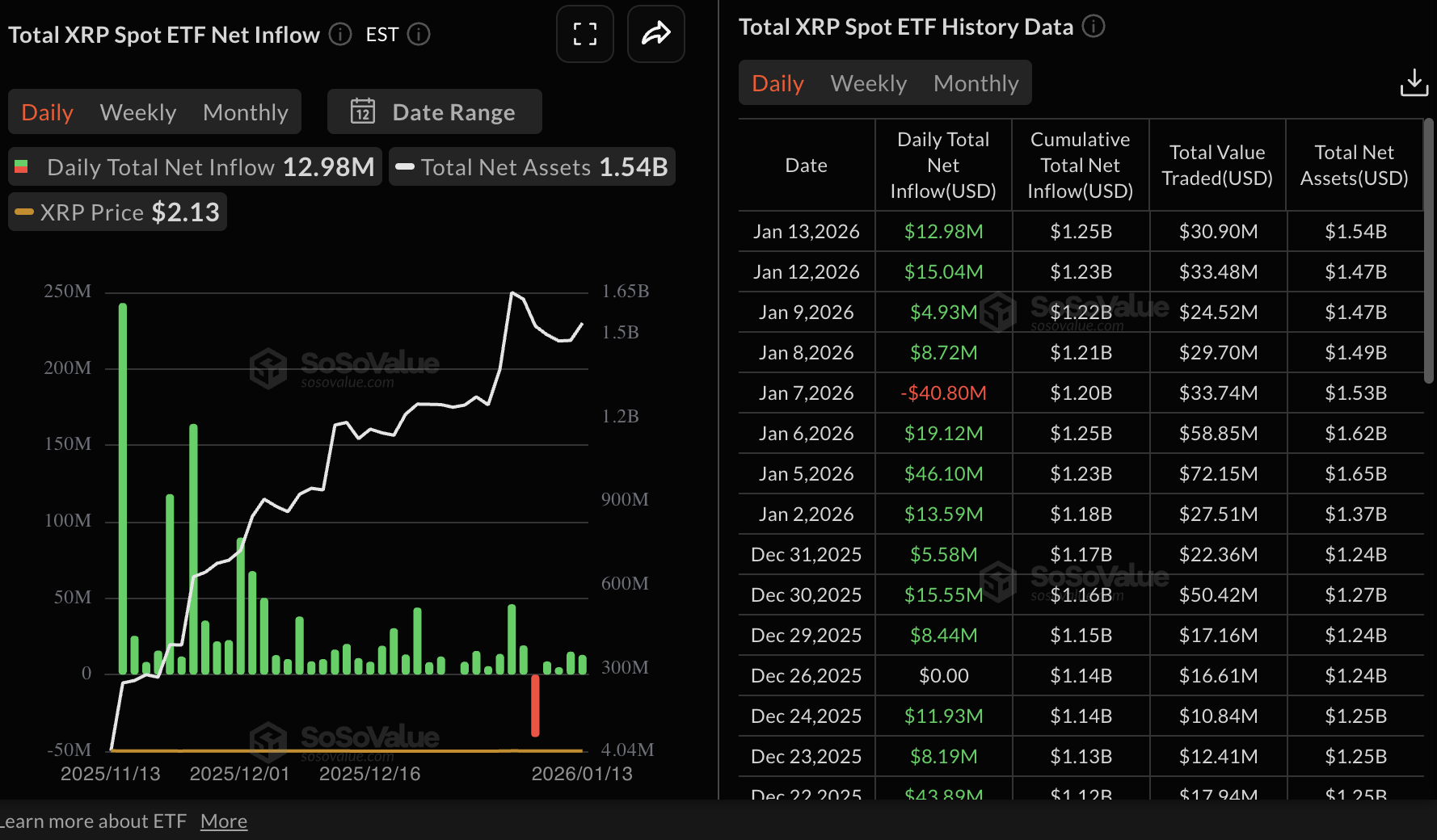 与此同时,XRP现货交易所交易基金(ETF)的兴趣持续增长,SoSoValue报告周二资金流入接近1300万美元。自去年11月推出以来,XRP ETF仅在1月7日录得一次资金流出,总额接近4100万美元。目前累计流入达到12.5亿美元,净资产为15.4亿美元。