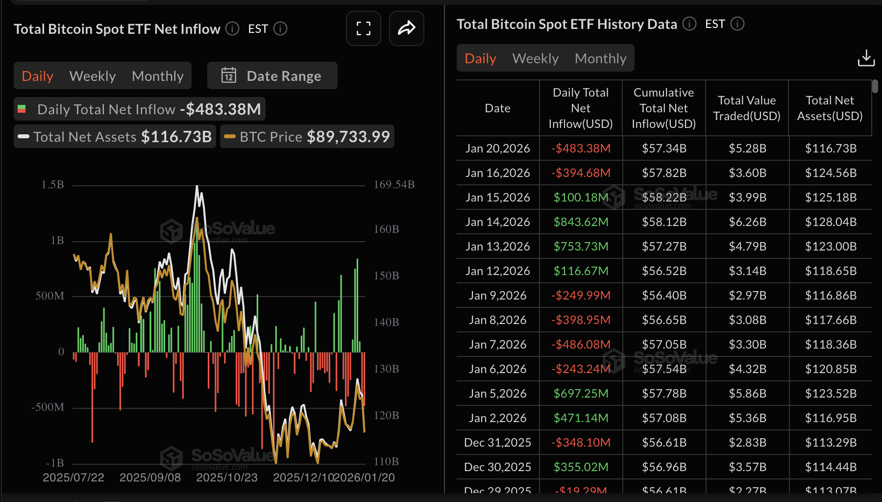 比特币现货交易所交易基金(ETFs)连续第二天出现资金外流,周二提款4.83亿美元。累计总流入约为573亿美元,净资产为1167亿美元。