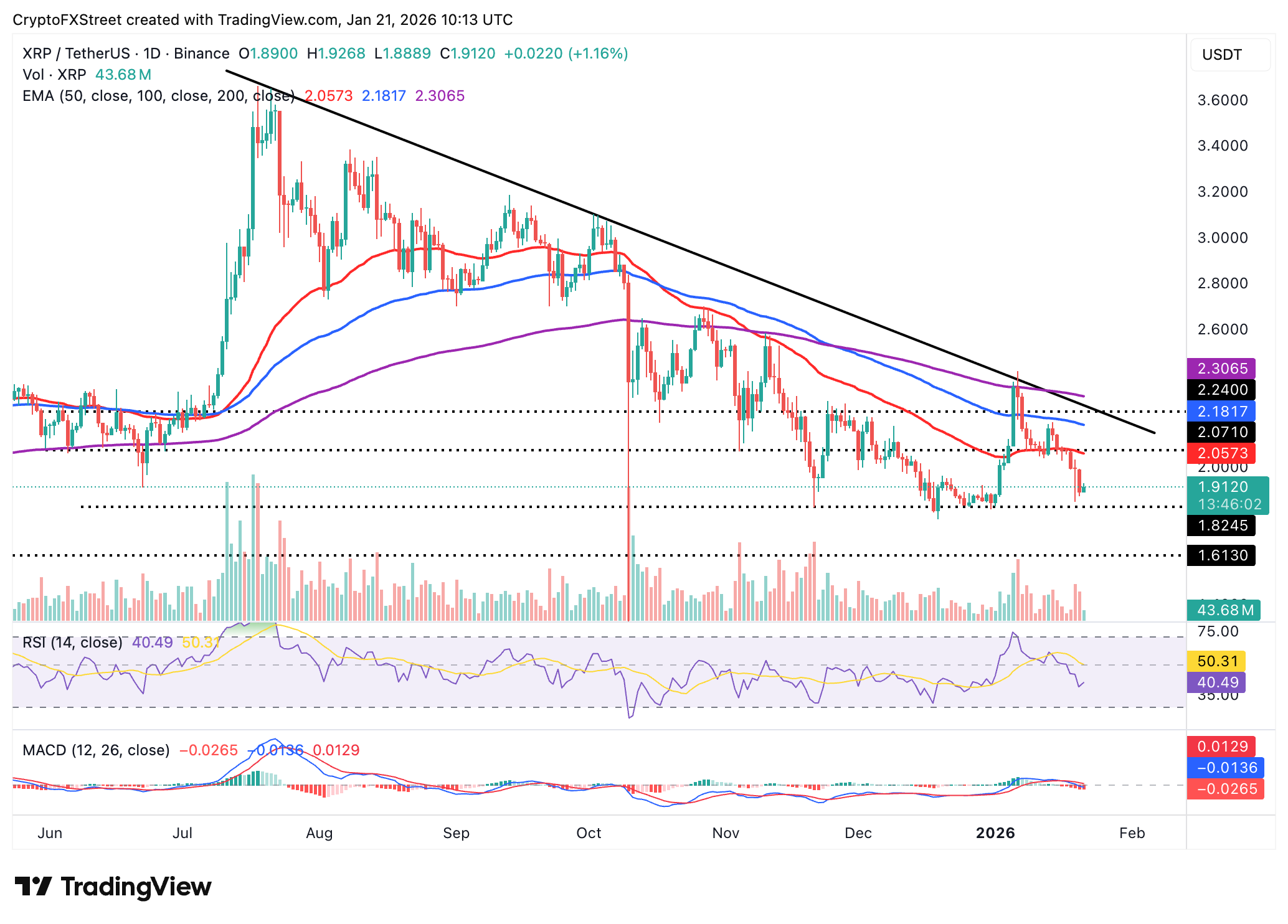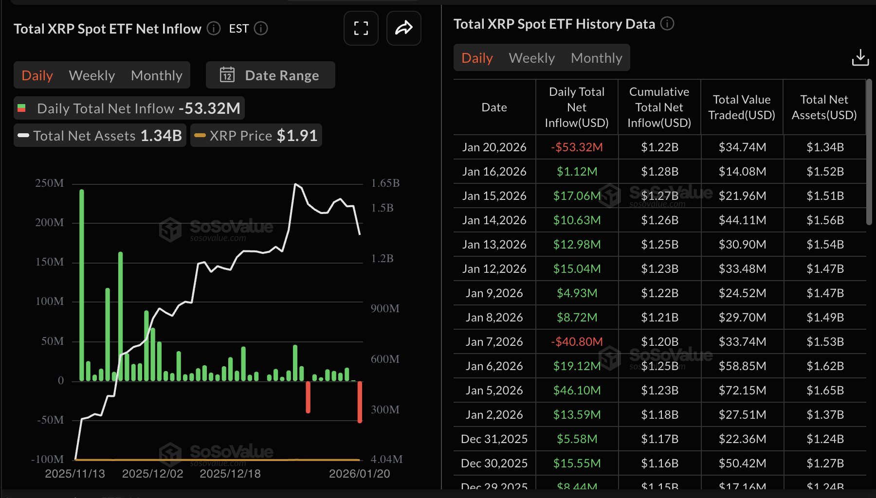 • XRP在1.90美元以上保持稳定,因为美国上市的现货ETF自推出以来记录了第二次资金外流。