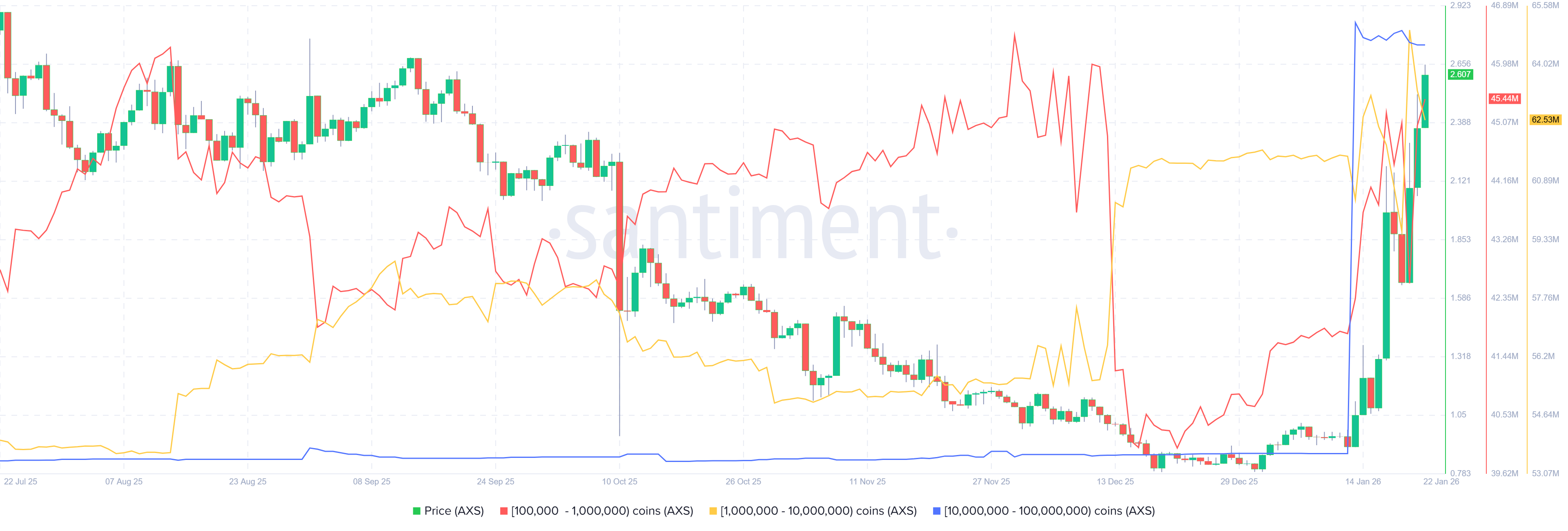 该指标显示,持有10万到100万AXS代币的鲸鱼(红线)、持有100万到1000万AXS代币的鲸鱼(黄线)以及持有1000万到1亿AXS代币的鲸鱼(蓝线)从1月12日到周四共积累了1.0056亿个代币。