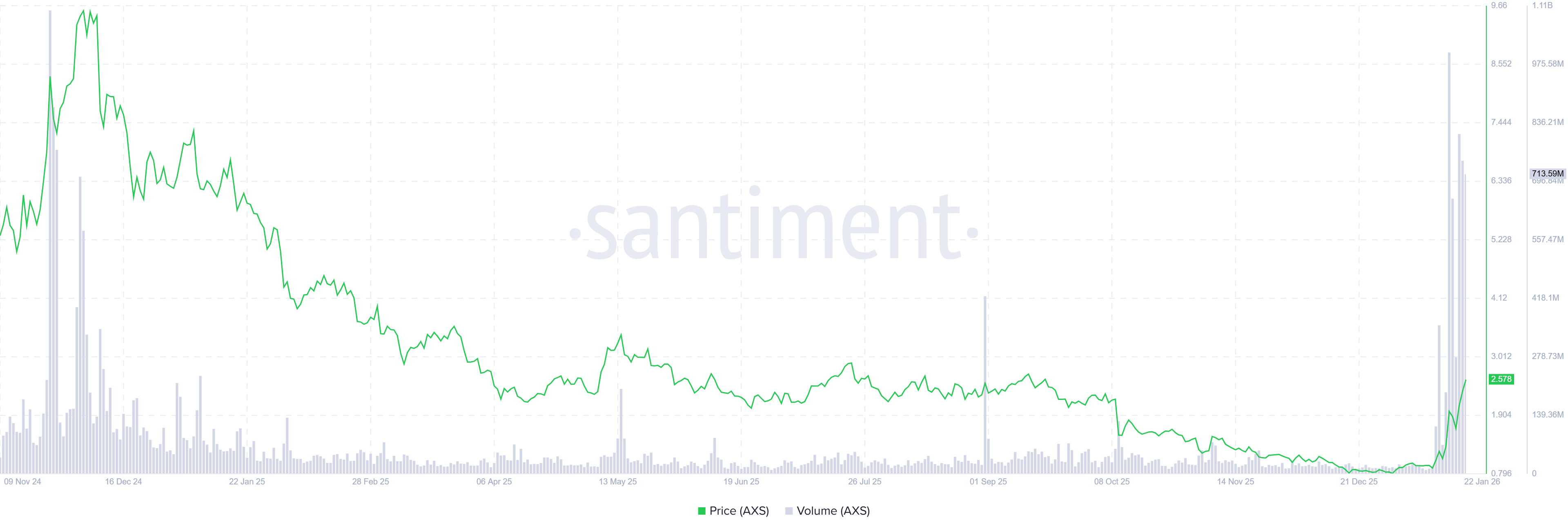 Santiment数据显示,AXS生态系统的交易量(链上所有交易应用生成的总交易量)在1月17日达到了10亿美元,为2024年11月以来的最高水平,并在周四保持在约7.1359亿美元。这一交易量的上升表明交易者对Axie Infinity的兴趣和流动性激增,进一步提升了其看涨前景。