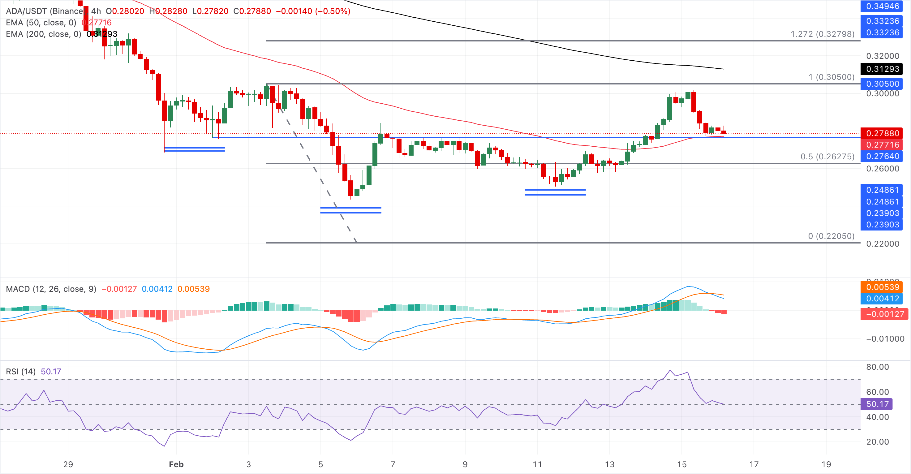 如果ADA跌破0.2772美元,可能会测试从2月3日的0.3050美元高点到2月6日的0.2289美元低点测得的50%回撤位0.2669美元。