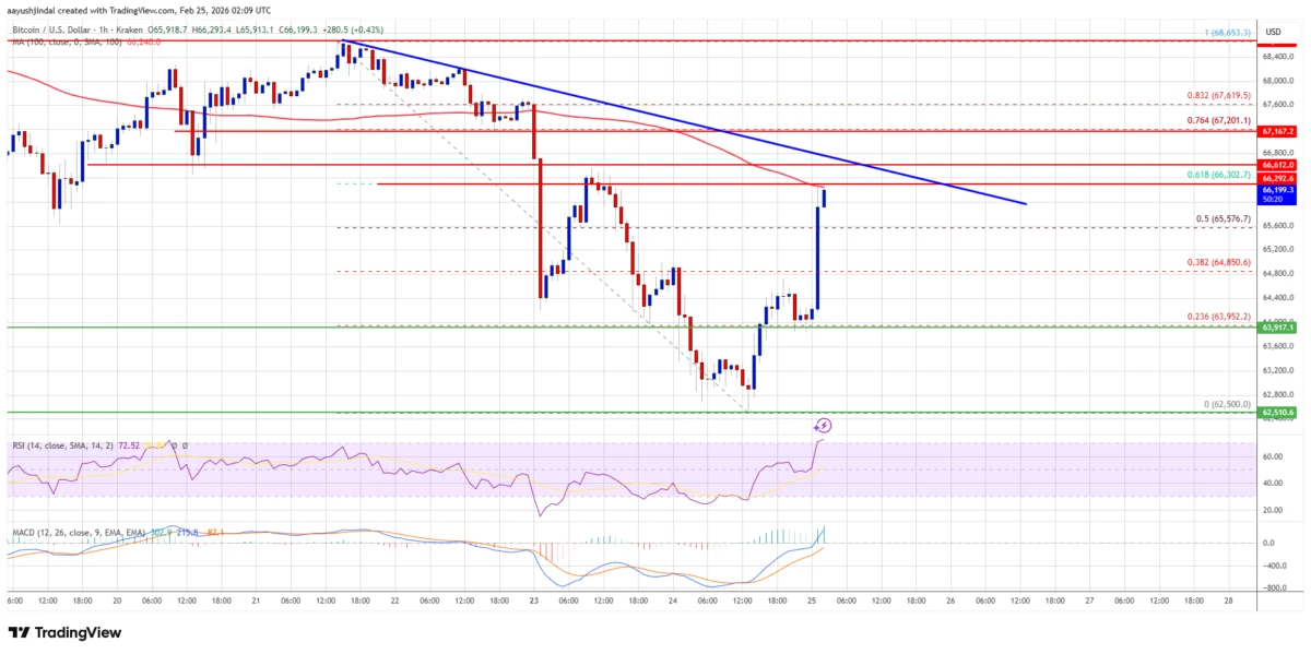 回顾此前走势,比特币价格未能在66,000美元上方保持稳定。BTC开启新一轮下跌,并跌破65,000美元支撑区域,一度进一步下探至64,000美元下方。价格甚至短线跌破63,000美元,最低触及62,500美元,随后开始回补部分跌幅。期间一度反弹站上65,000美元,并上破从68,654美元阶段高点到62,500美元低点这段下跌的50%斐波那契回撤位。