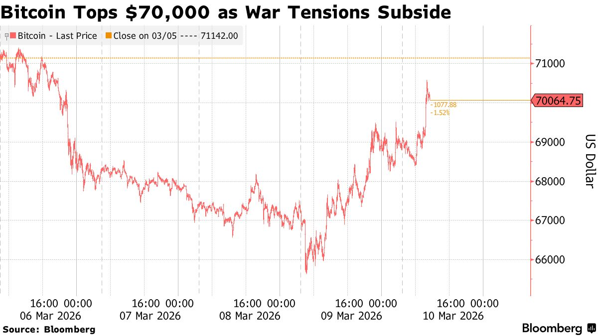 FX168财经报社(亚太)讯 在美国总统特朗普有关伊朗冲突可能“很快结束”的表态缓解市场紧张情绪后,周二(3月10日)亚洲时段比特币重新升破 7万美元 关口,为四天来首次,完成了对周末一轮急跌行情的快速修复。此前,这一市值最大的数字资产一度因市场避险情绪升温跌至 6.5万美元 附近。