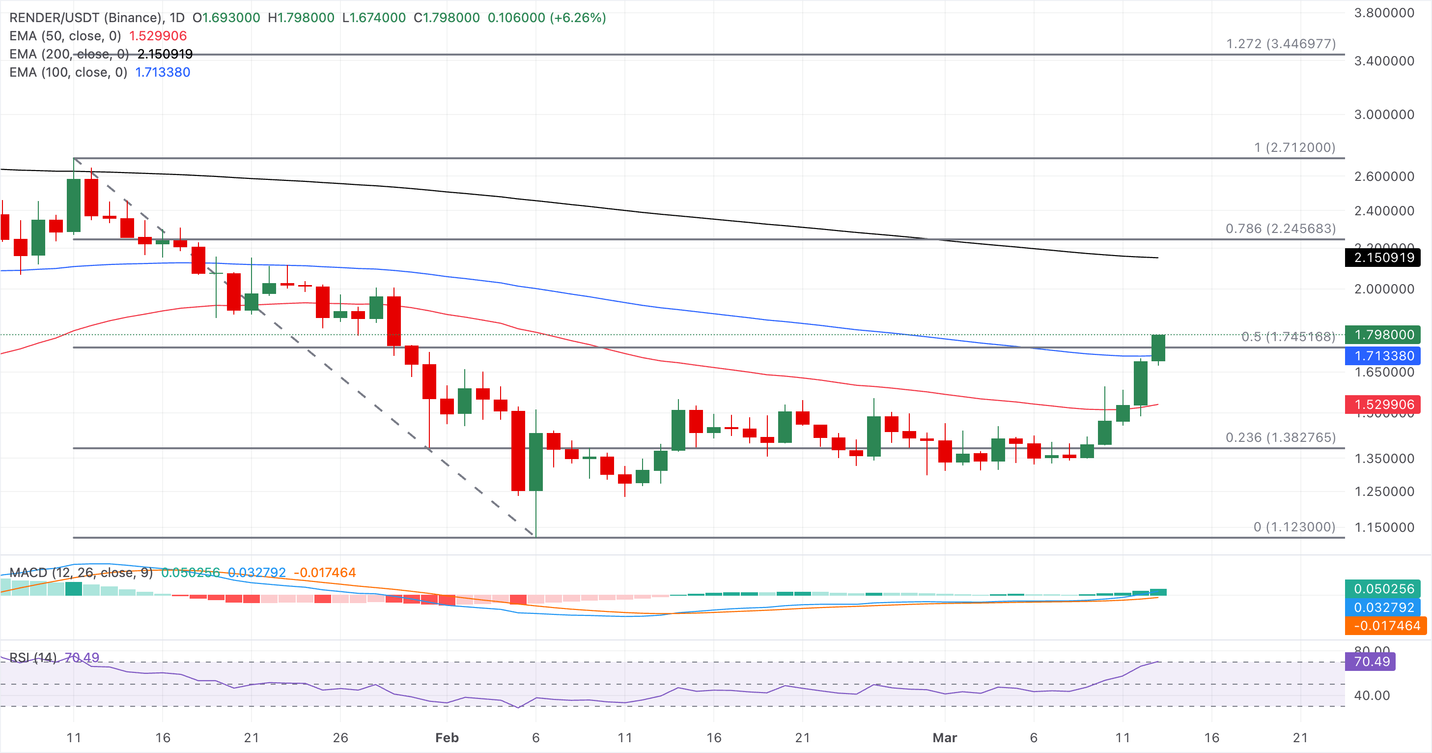 Render连续第五天上涨,使总涨幅超过30%。截至撰写时,RENDER周五上涨6%,突破100日EMA在1.71美元的水平,短期偏向看涨。
