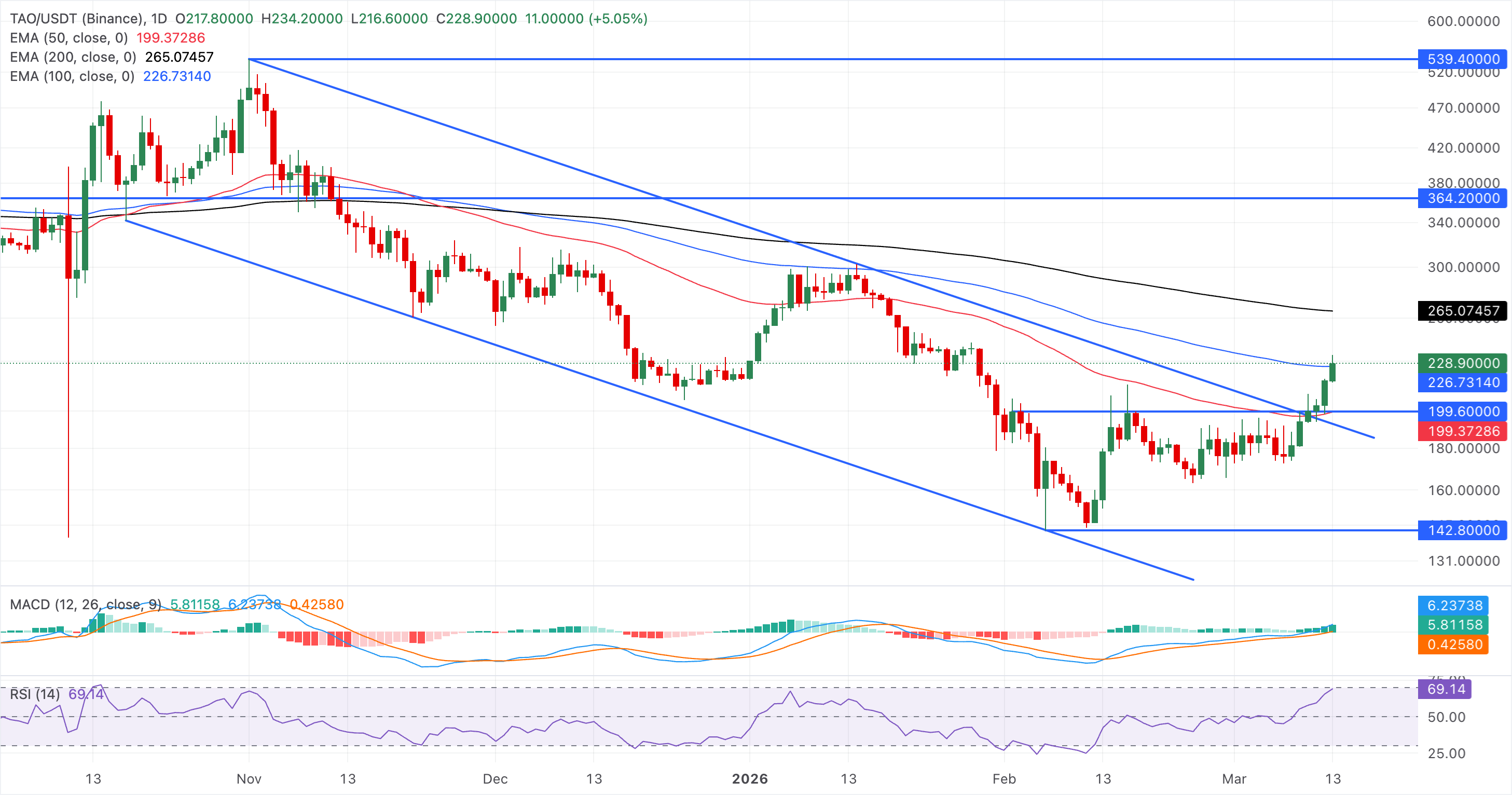 短期偏向看涨,因为TAO突破了下降通道模式的下降阻力趋势线和接近200美元心理关口的50日EMA,正如FXStreet所预期的那样。