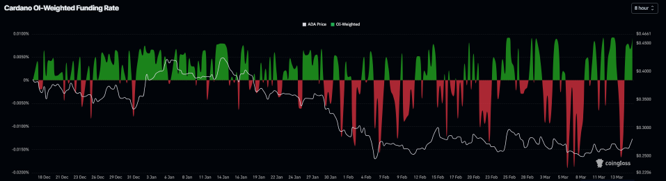 除了持有者的积累,衍生品数据也支持积极的偏向。CoinGlass 的数据显示,周一卡尔达诺在币安交易所的期货未平仓合约(OI)已达到 1.0463 亿美元,自 3 月初以来稳步上升。未平仓合约的增加代表着新资金或额外资金进入市场和新的买入,这可能推动当前 ADA 价格的上涨。