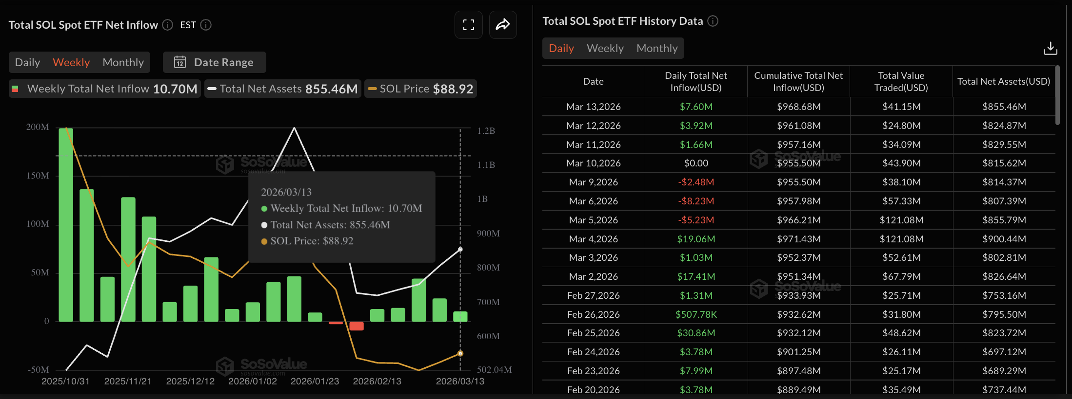 索拉纳保持了机构的兴趣,专注于SOL的交易所交易基金(ETF)在周五录得760万美元的流入,使其周净流入达到1070万美元。持续的ETF流入表明强劲的机构需求,这可能有助于减轻下行压力。