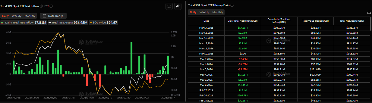 索拉纳(SOL)显示出强劲的迹象,周三交易价格为94美元,稳固在关键支撑区间上方,最近突破后。机构需求支持SOL的价格走势,现货交易所交易基金(ETF)录得超过1700万美元的资金流入。与此同时,链上和衍生品市场的改善条件暗示SOL在未来几天可能会迎来上涨。