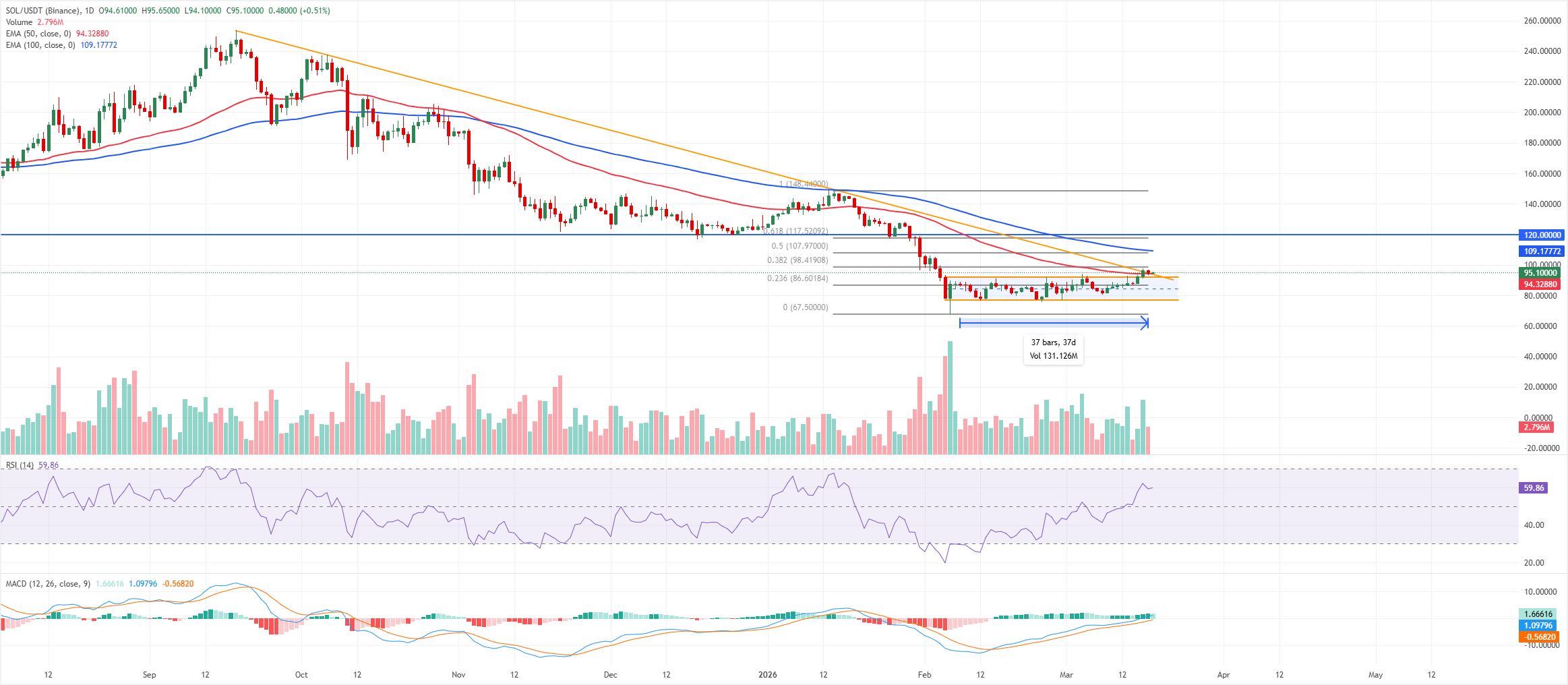 动能有所改善,日线图上的相对强弱指数(RSI)接近60,移动平均收敛发散(MACD)线保持在其信号线之上,处于正区间,尽管SOL价格仍低于接近110美元的下降100日指数移动平均线。