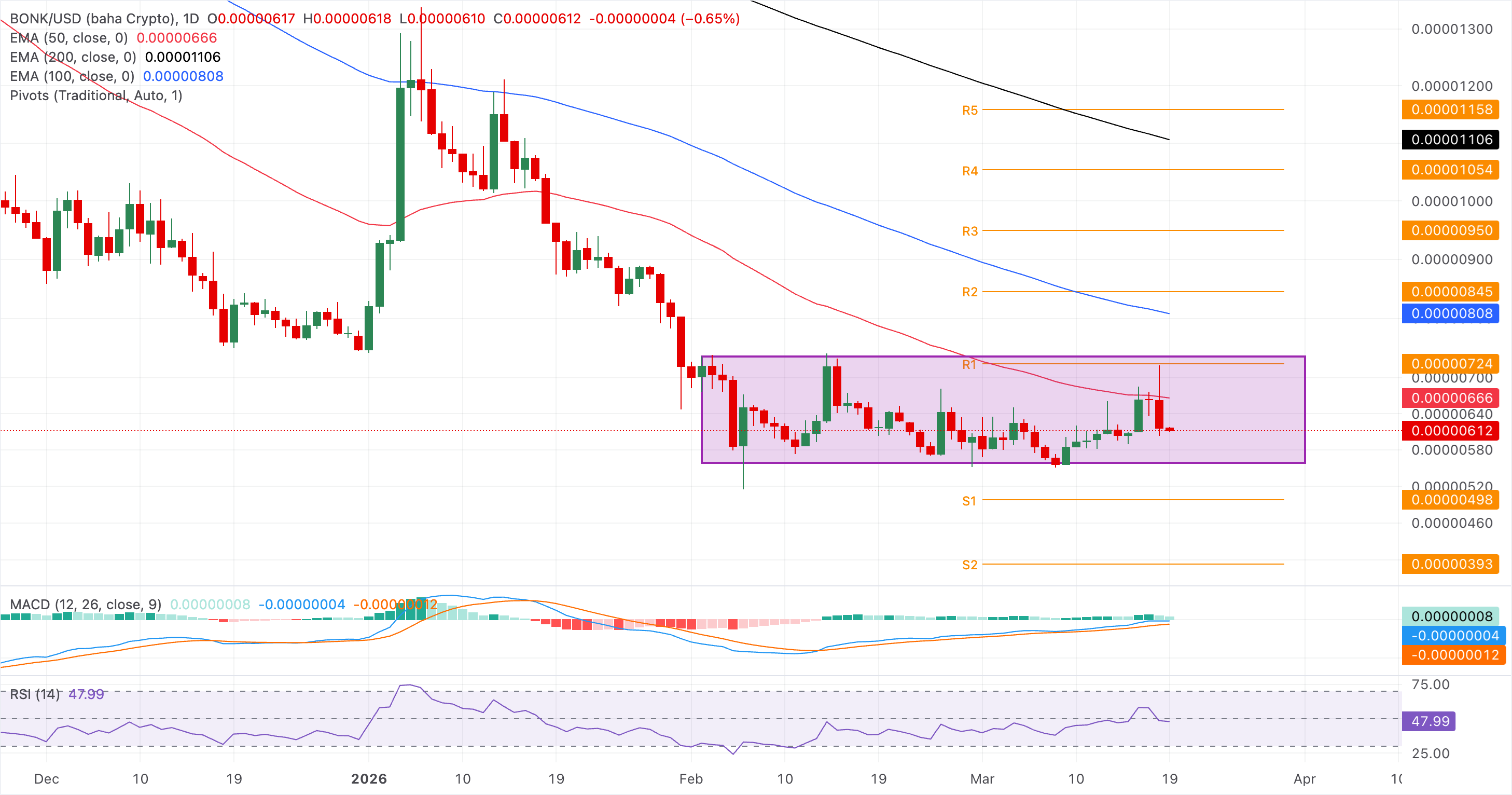 Bonk在周四新闻发布时保持在0.00000600美元以上,此前一天下跌7%。技术背景中性,略微向下倾斜,因为BONK在盘整区间内反转,而50日、100日和200日EMA下降,保持整体看跌偏向。