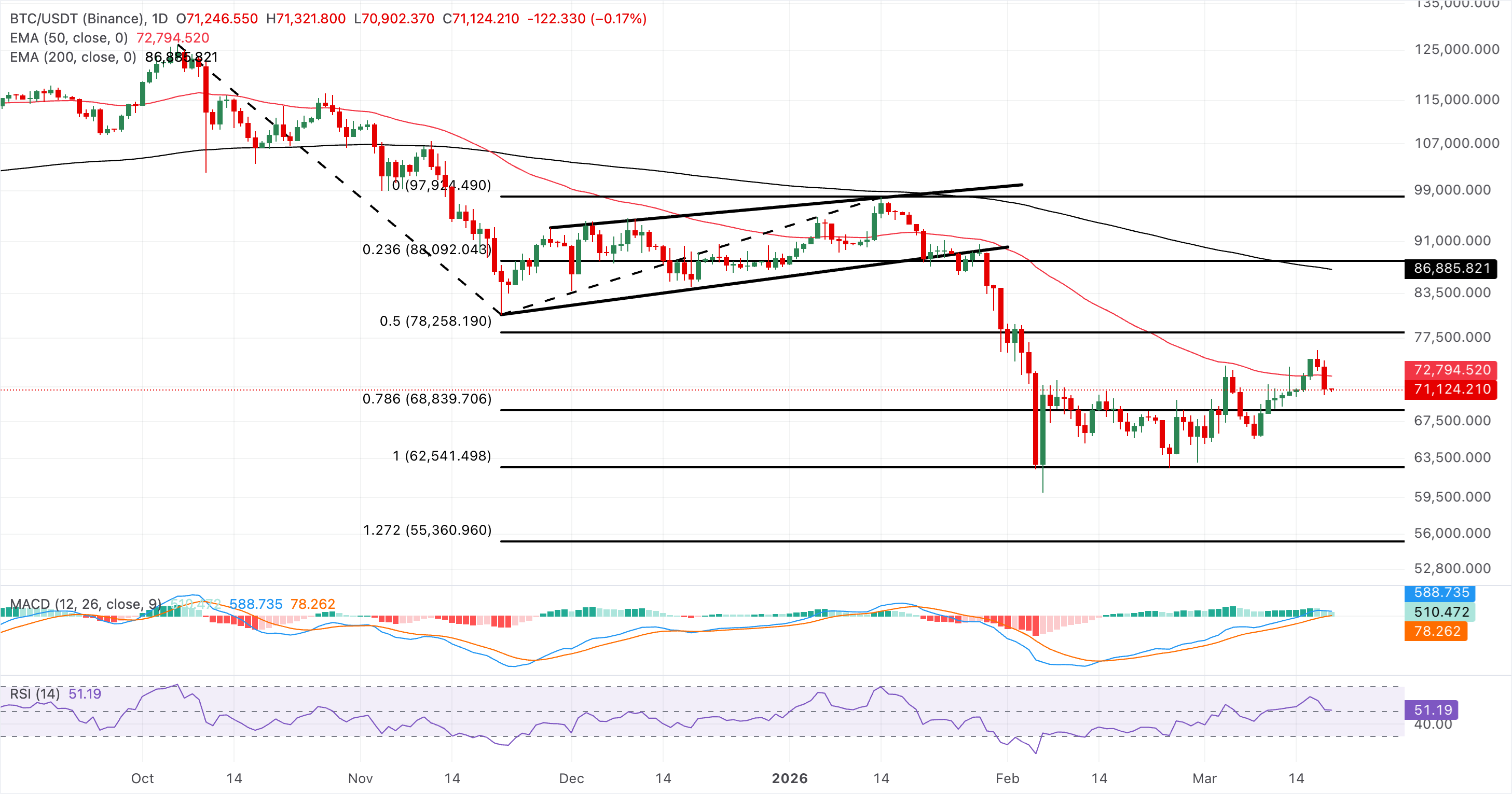截至周四新闻发布时,比特币徘徊在71,000美元附近,连续第三天延续跌势,此前周三下跌3%。加密之王在50日指数移动平均线(EMA)71,089美元下方收盘,目标是78.6%基于趋势的斐波那契水平68,839美元作为近期支撑。