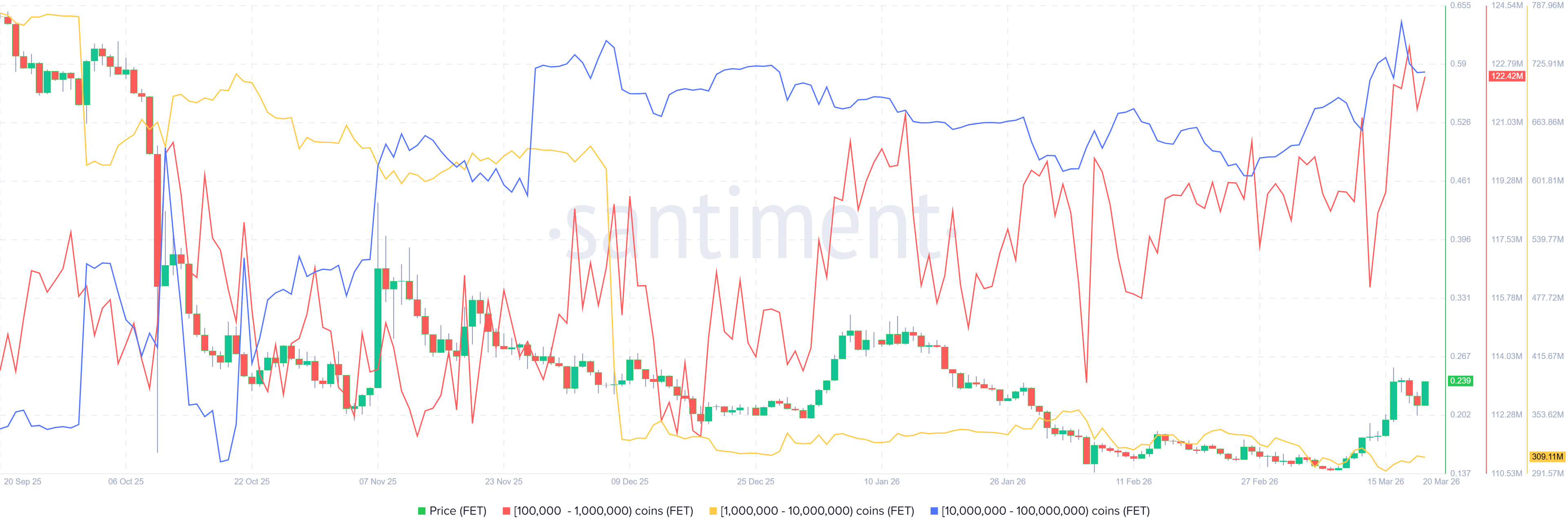 • 链上数据显示看涨,部分鲸鱼正在积累FET代币。
