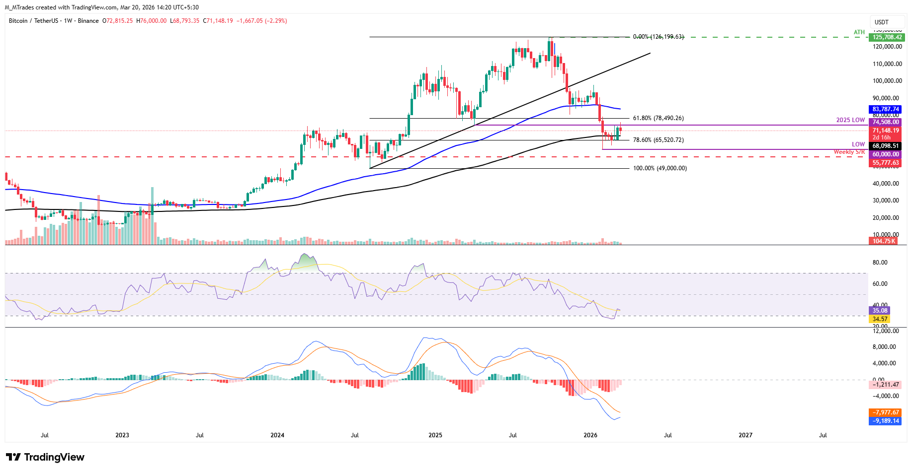 如果200周EMA的60,098美元支撑位有效,比特币可能延续反弹,向下一个心理阻力位75,000美元靠近,接近2025年年低点。若收盘价站稳该水平,可能进一步上涨至61.80%斐波那契回撤位78,490美元(该回撤位由2024年8月低点49,000美元至2025年10月历史高点126,199美元绘制)。