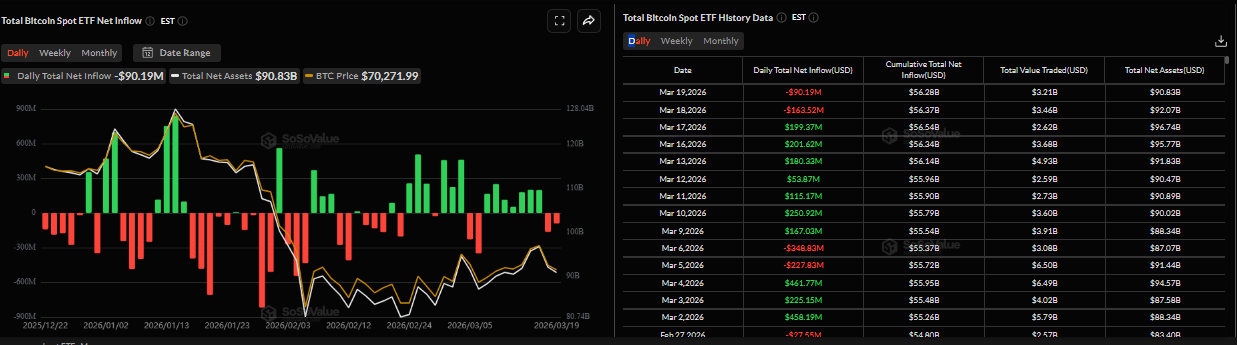 截至周五撰稿时,比特币(BTC)维持在7万美元附近,本周迄今下跌近3%,终结了连续两周的回升。美联储(Fed)3月货币政策决议中的鹰派基调削弱了市场情绪,压制了这位加密货币之王的价格。同时,现货交易所交易基金(ETF)资金流的交替表现显示机构投资者日益犹豫,暗示BTC可能维持区间震荡格局。