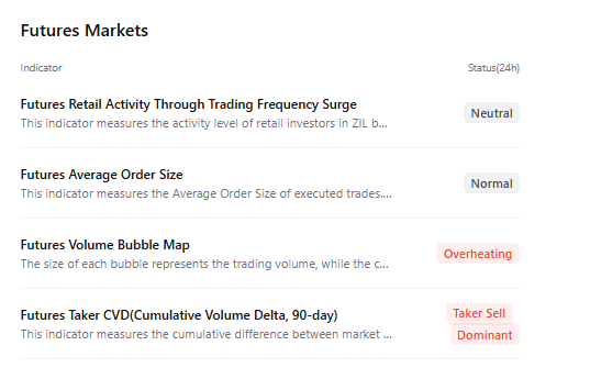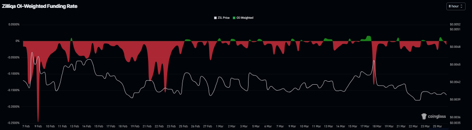 在衍生品方面,负资金费率显示交易者情绪偏向看跌。该指标周四转为负值,读数为-0.014%,表明空头支付多头资金费率,暗示市场对ZIL持看跌态度。