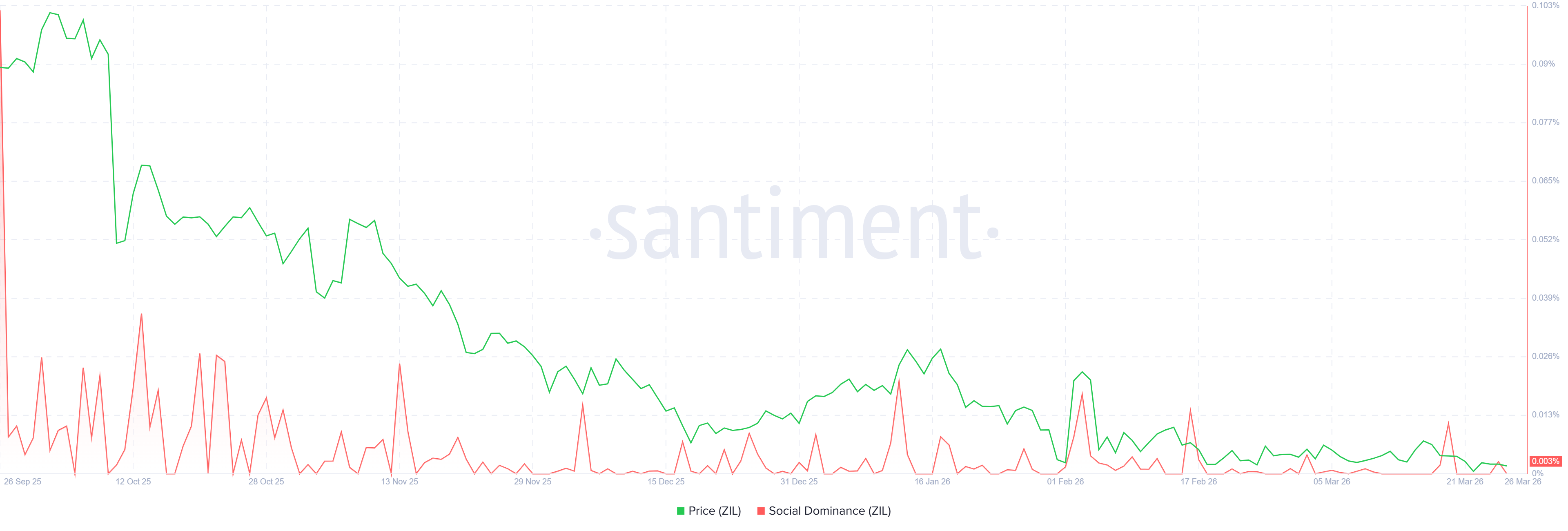 Santiment的ZIL社交主导指标也支持看跌前景。该指数衡量加密货币媒体中与ZIL相关讨论的份额。自3月中旬以来,该指标呈下降趋势,周四读数为0.003%。这一下降表明ZIL投资者的市场兴趣和情绪正在减弱。