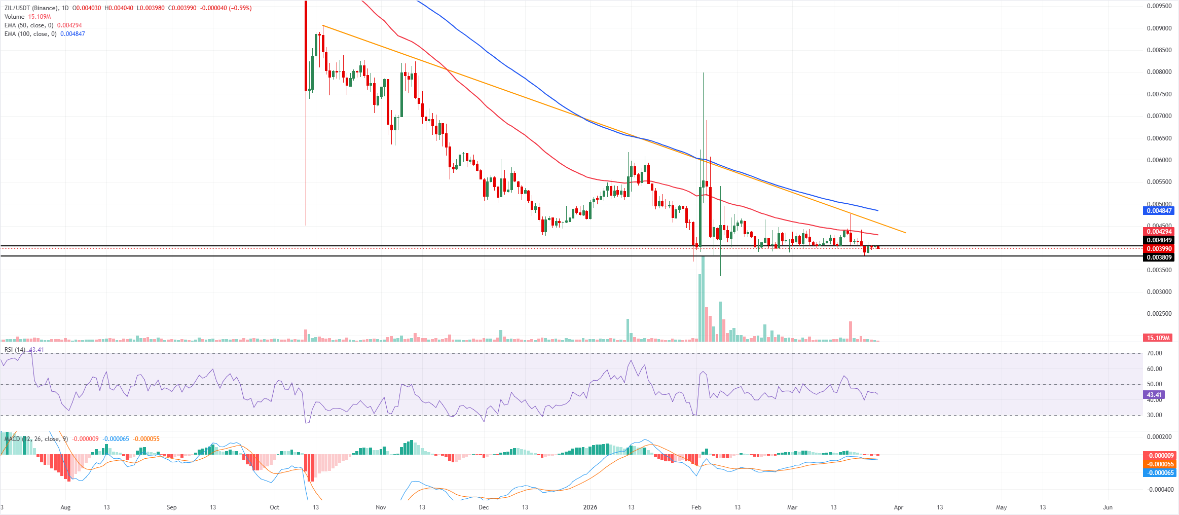 下方初步支撑位于0.0038美元,此处为前期低点与水平线汇聚;若跌破该支撑,将暴露更深的跌幅,目标指向0.0035美元区域,只要价格维持在0.0043至0.0046美元阻力区间下方,看跌偏向将保持不变。