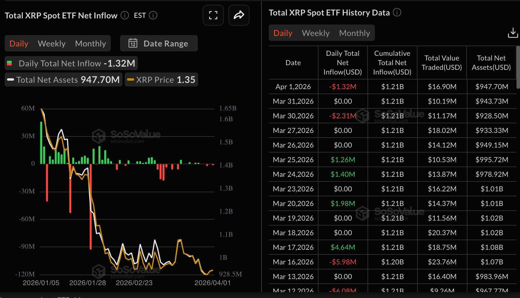 XRP交易所交易基金(ETF)的兴趣进一步恶化,周三出现132万美元的轻微资金流出,继周二活动低迷之后。XRP ETF周一也录得约230万美元的资金流出,削弱了风险偏好。