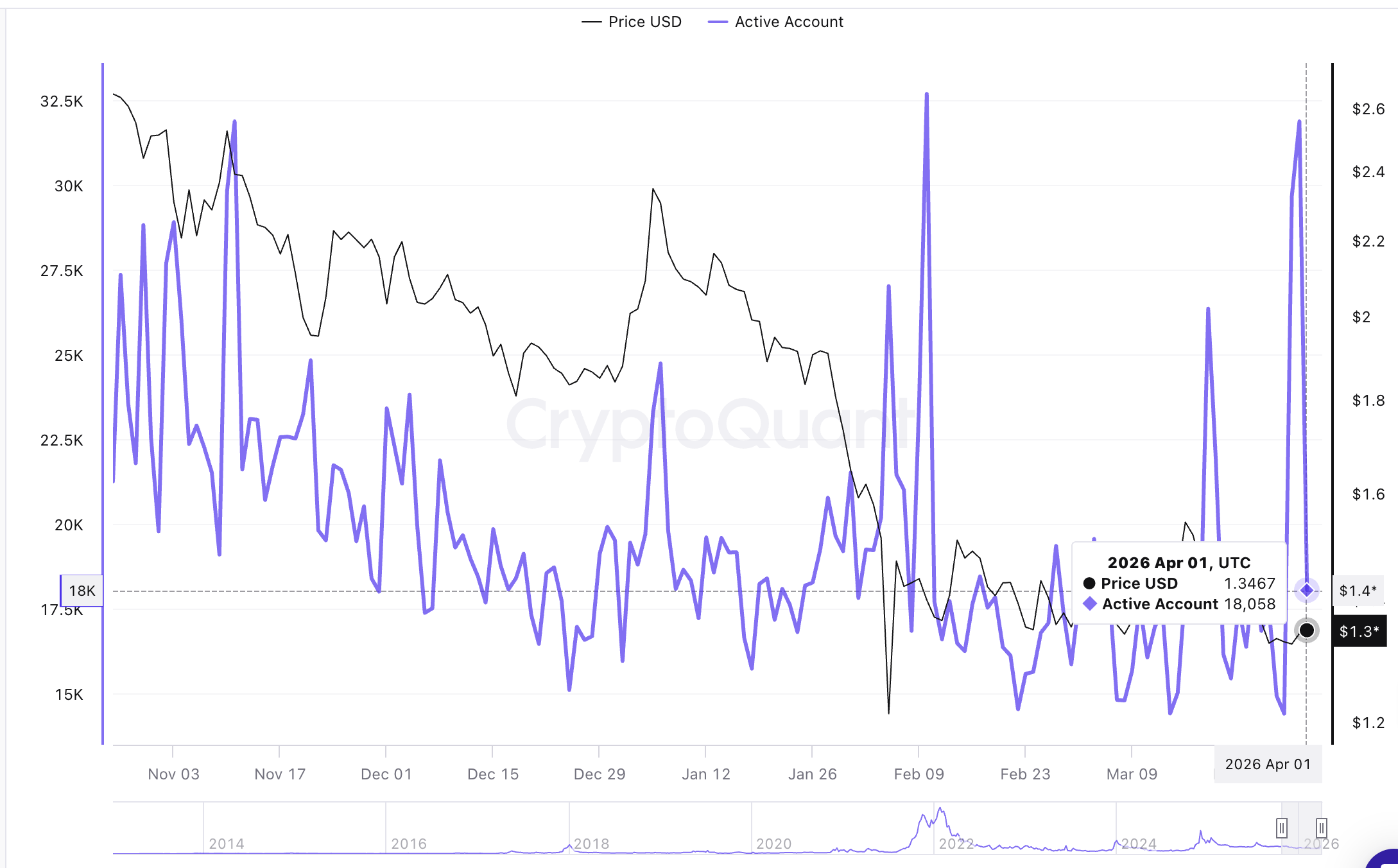 下方CryptoQuant图表显示,自2月初以来,除少数活跃地址的孤立激增外,XRP需求一直保持低迷。缺乏稳定的用户参与,买盘压力收窄,动能减弱。