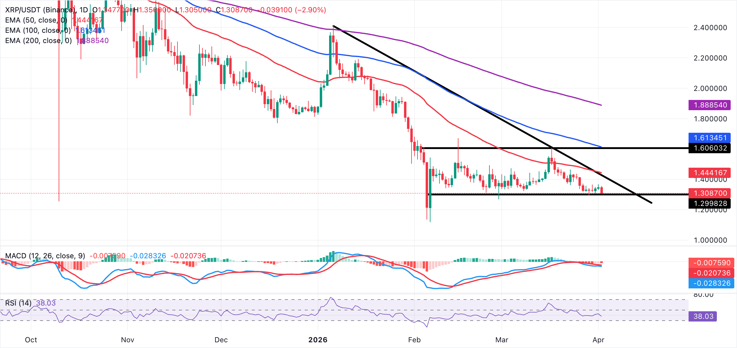 XRP在1.30美元附近小幅下跌,短期内呈现明显看跌偏向,价格延续跌破下降阻力趋势线。该汇款代币价格维持在50日指数移动平均线(EMA)下方,后者位于约1.44美元。同时,100日和200日EMA分别位于约1.61美元和1.89美元,远高于现价,强化了更广泛的下行格局。