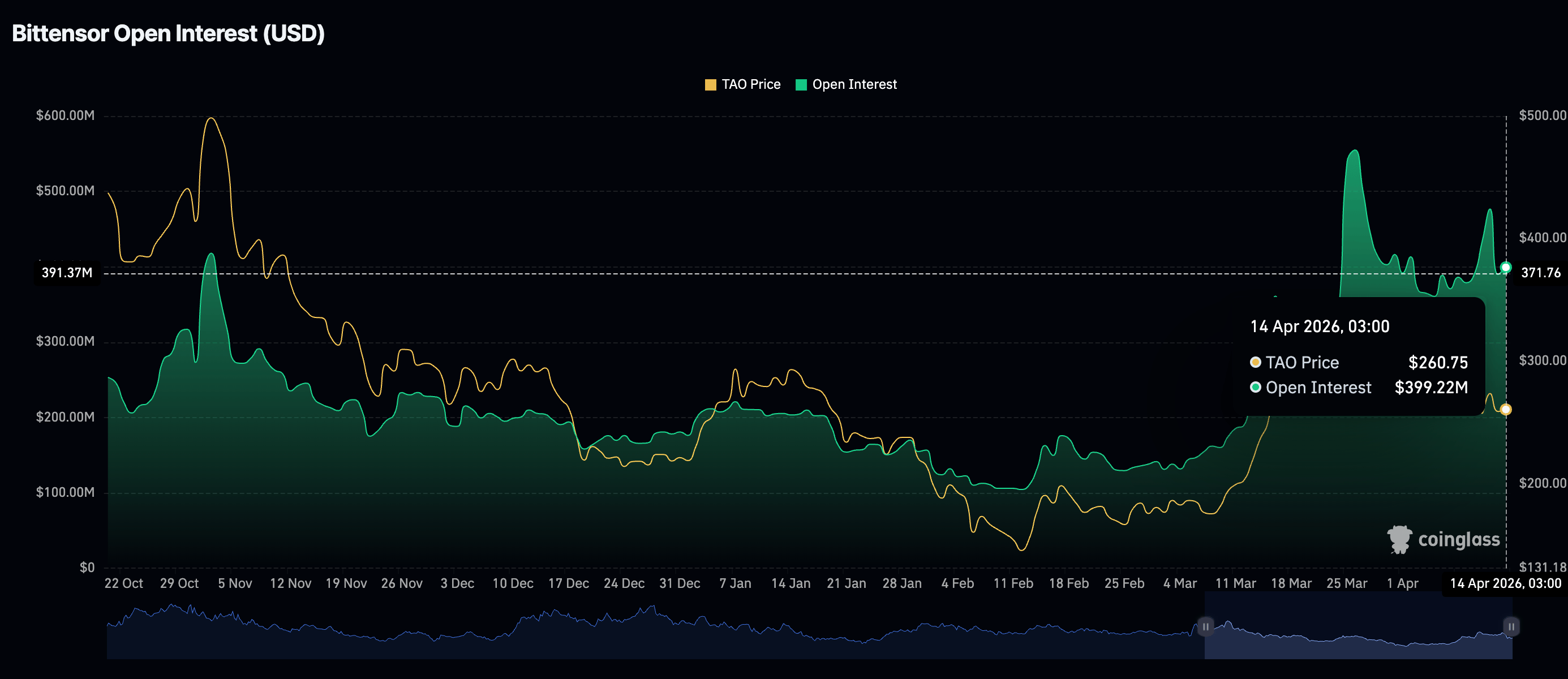 在Bittensor衍生品市场上周降温后,零售投资者的风险偏好正在扩大。周二,TAO期货未平仓合约维持在约4亿美元,较前一日的约3.9亿美元有所上升。