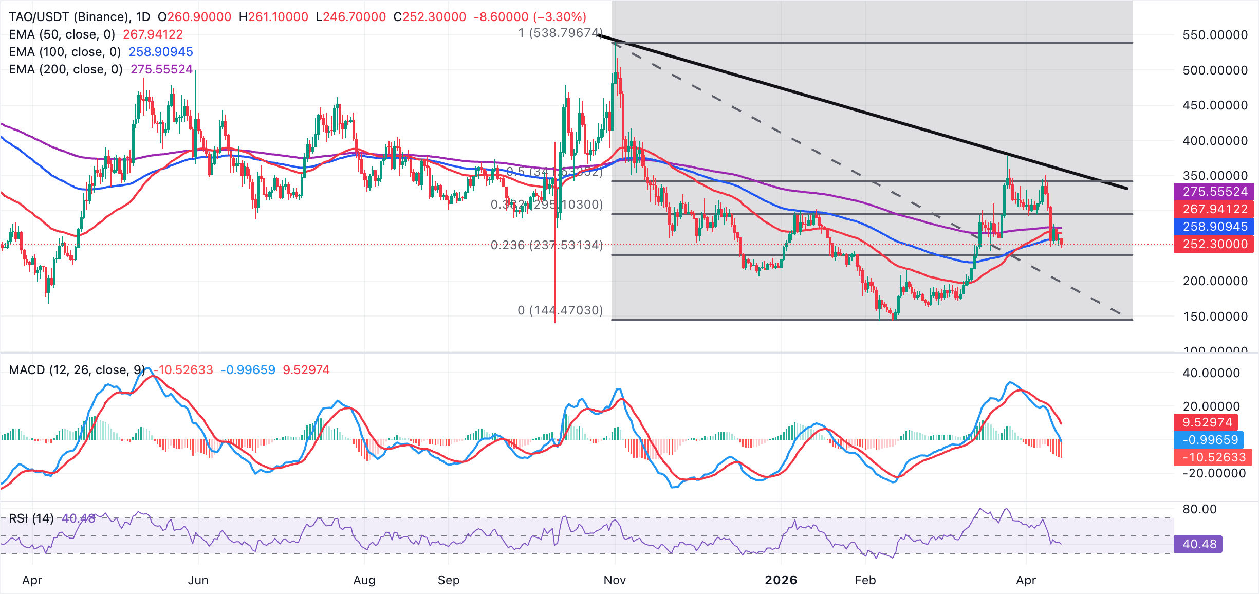 Bittensor(TAO)处于活跃的下行趋势,截至周二撰写时,价格下跌近3%,交易于约252美元。自上周子网开发者Covenant AI退出以来,围绕加密人工智能(AI)市场的情绪显著低迷。