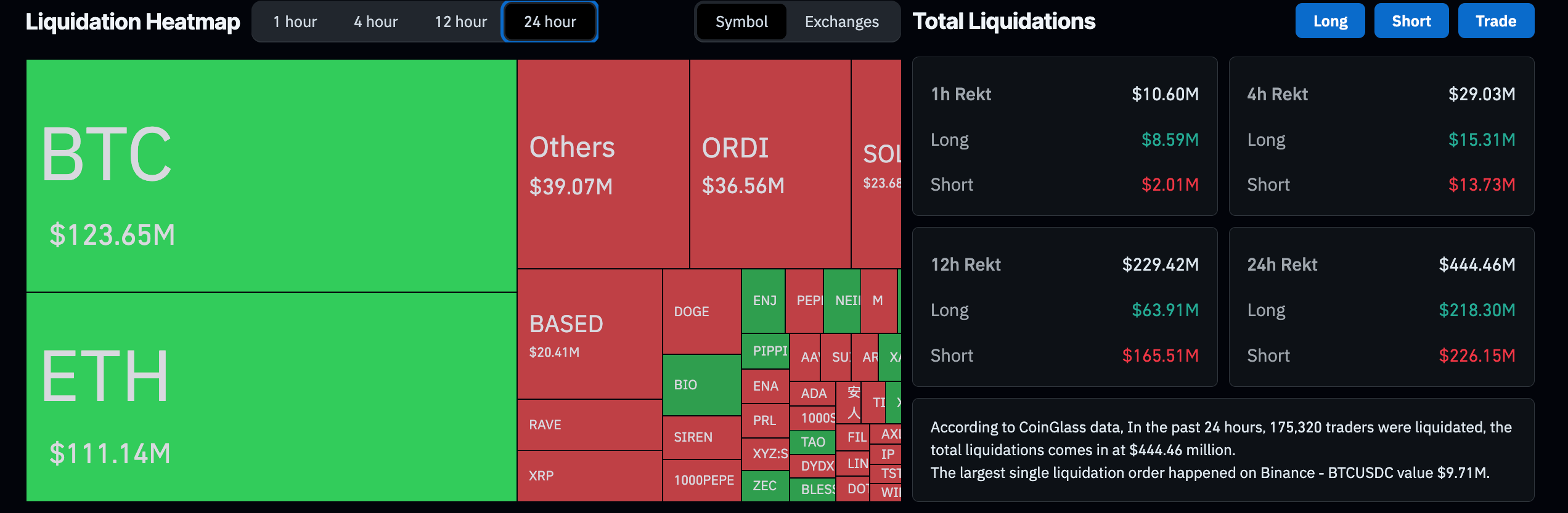 与此同时,加密货币市场在过去24小时内录得4.44亿美元的清算,其中空头清算为2.26亿美元,多头清算为2.18亿美元。多头和空头清算几乎相等,表明市场波动性加剧,价格剧烈波动。