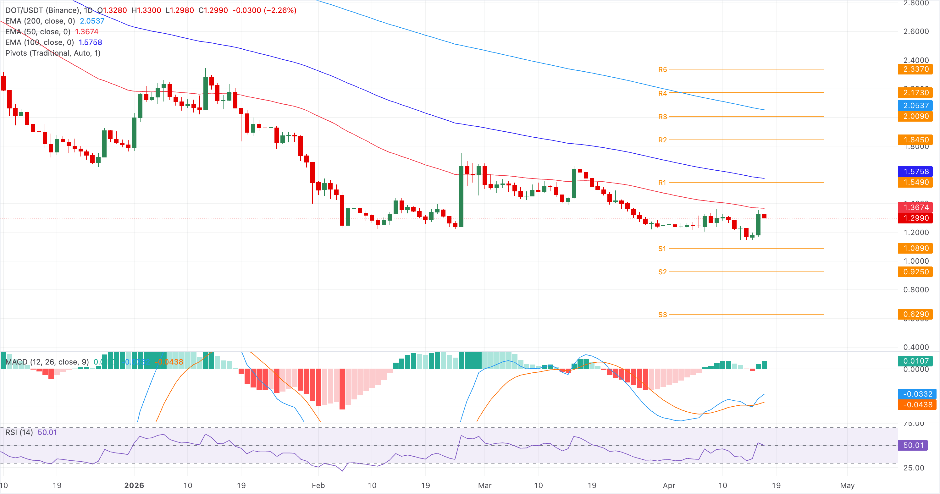 Polkadot在周五撰写时保持在1美元以上,整体处于50日、100日和200日EMA下方的看跌格局,这些均线持续限制上涨空间,构成主导的下跌趋势结构。