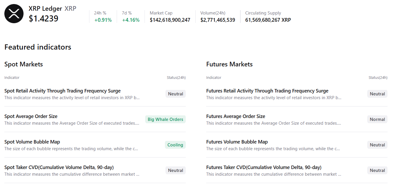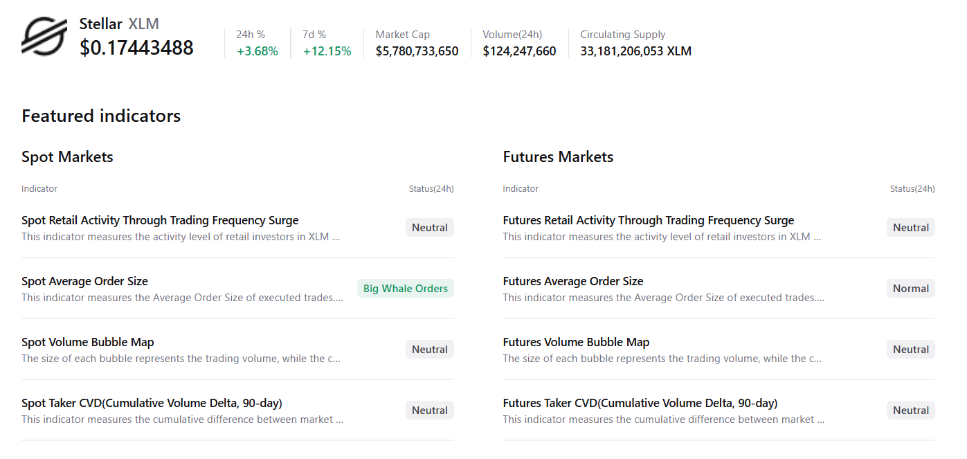 XRP现货市场显示大型鲸鱼订单和降温的市场状况,其他指标大多保持中性,暗示潜在的上涨空间。类似地,XLM现货市场也显示大型鲸鱼订单,其他指标大多中性,表明看涨前景。