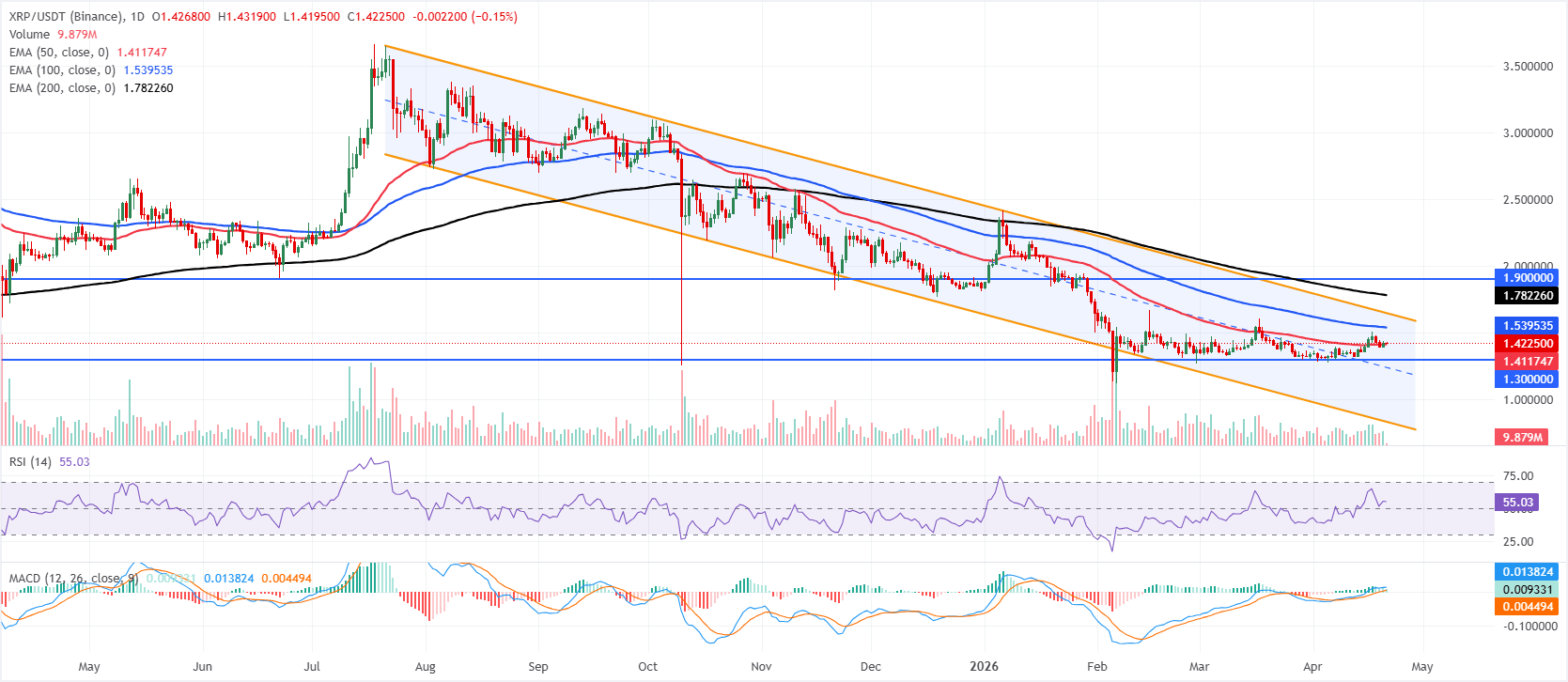 周二,XRP价格为1.42美元,前一日收盘突破关键的50日指数移动均线(EMA)阻力位1.41美元。