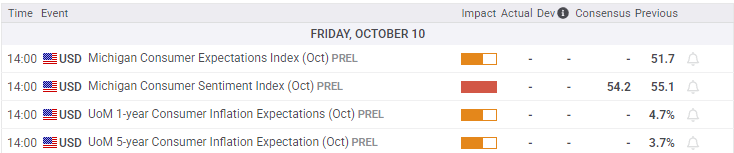 政府停摆还限制了官方数据集的发布,使市场不得不更加关注私人数据集。本周的关键发布将是密歇根大学(UoM)10月份消费者信心指数,定于周五发布。预计综合消费者调查结果将略有放缓,因为持续的贸易战头条和上升的通胀压力正在侵蚀消费者信心。