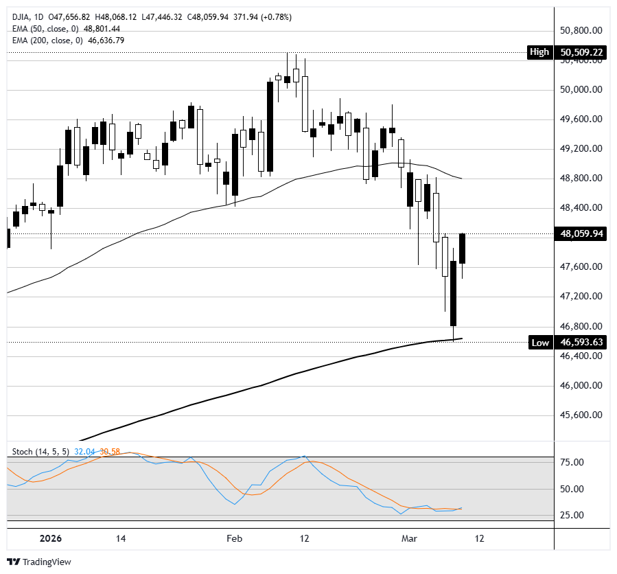 道琼斯工业平均指数在周二上涨,重新测试48000点以上的图表区域,延续周一的戏剧性反转。标准普尔500指数和纳斯达克综合指数也有所上涨,股市普遍出现反转。整个交易过程中波动剧烈,道琼斯指数在低点时下跌了300点,但随后恢复。此次反弹主要受到原油价格大幅回落的推动,交易者对美伊冲突可能接近尾声感到乐观,同时国际能源署(IEA)召开紧急会议,讨论协调释放战略原油储备。