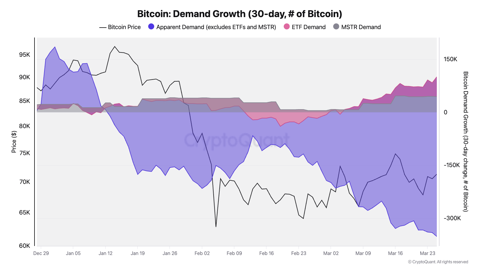 此外,Moreno在下方图表中分享了他的分析:“目前,除去ETF和Strategy,比特币需求在过去30天内减少了452,000枚,如图中紫色区域所示。”