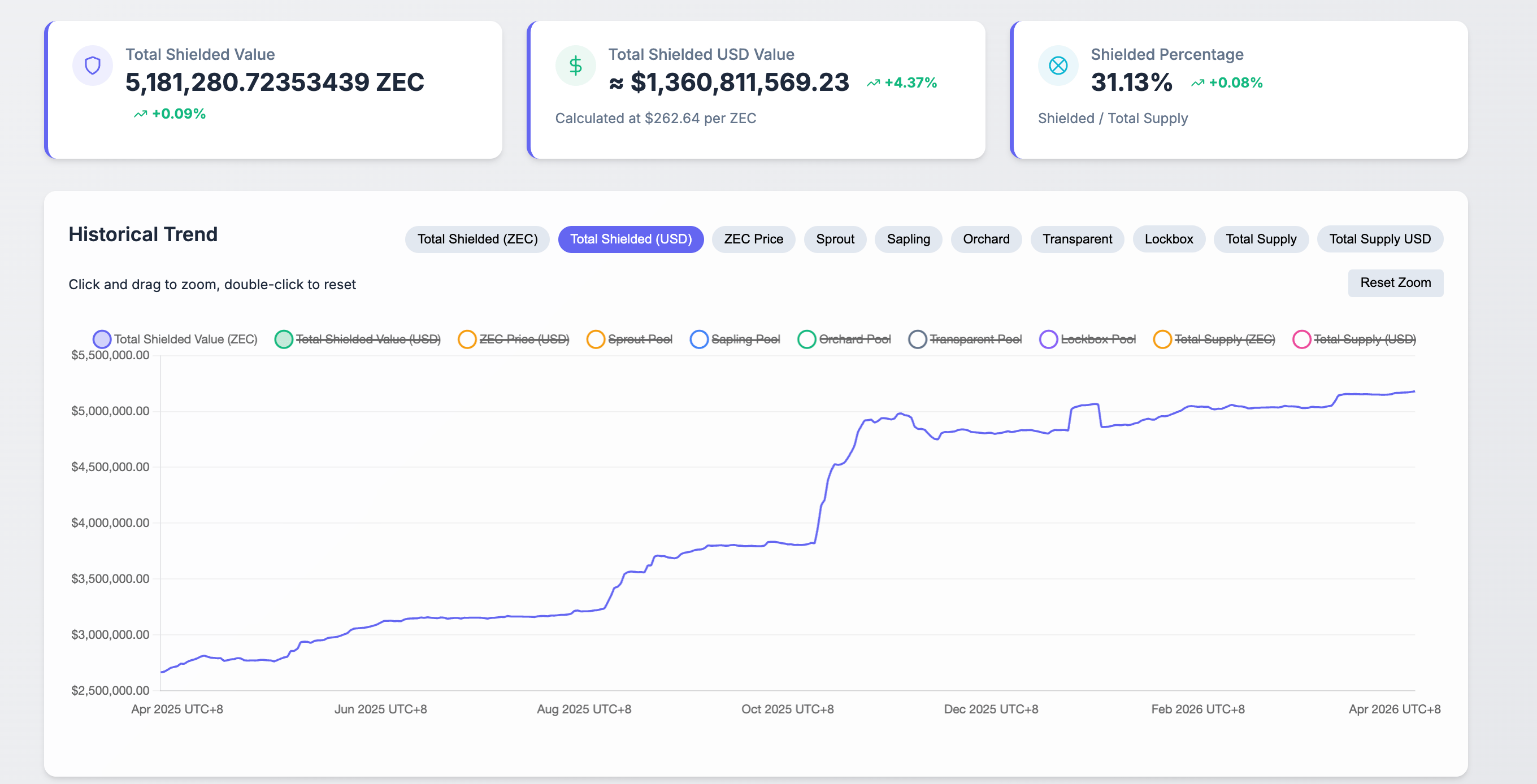 在网络方面,通过屏蔽ZEC代币实现的Zcash隐私采用率已趋于稳定。根据Zkp.baby数据,屏蔽ZEC代币占总供应量的31.13%,采用率的激增可能推动现货价格上涨。