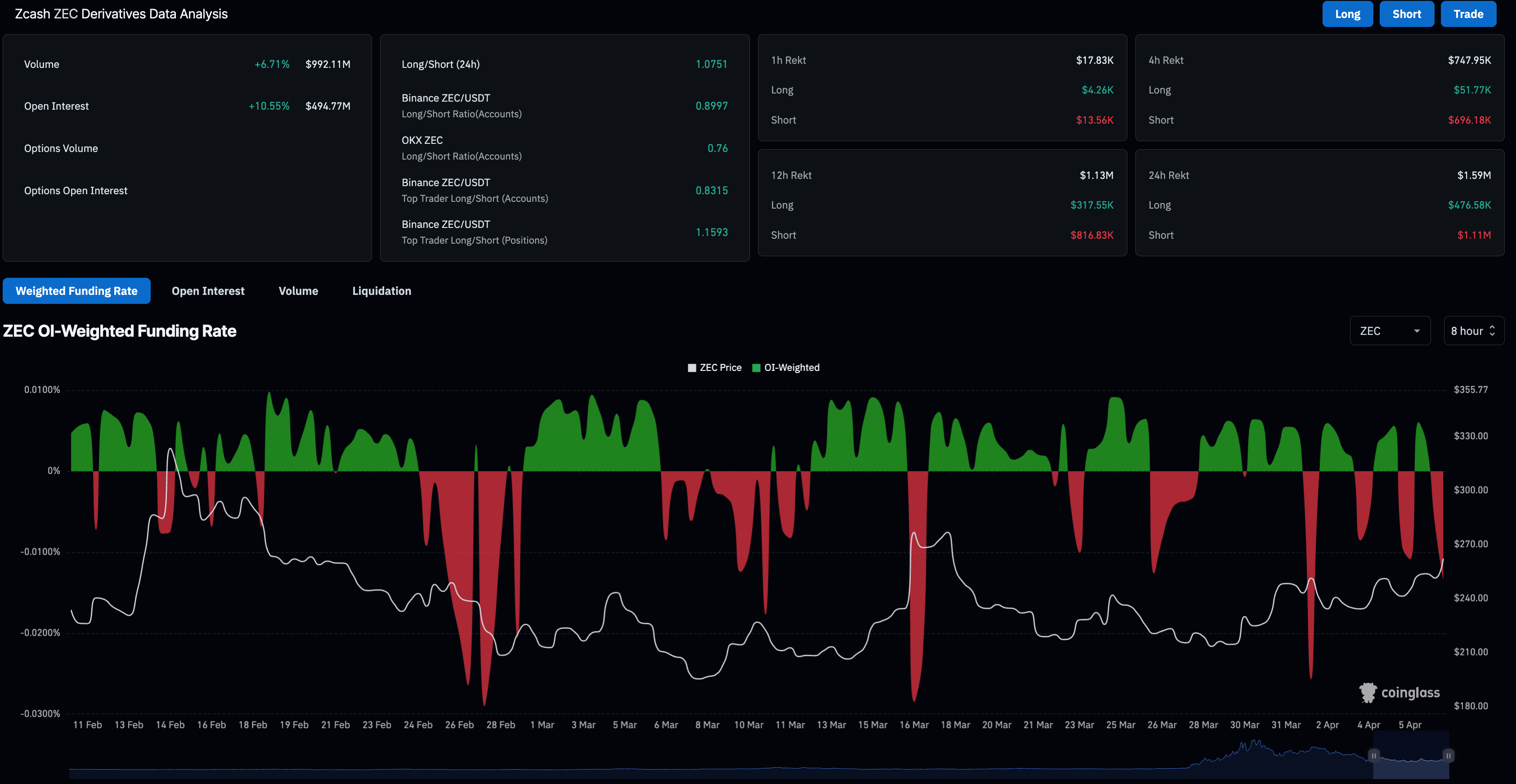 在即将到来的美伊截止日期前,Zcash在更广泛的市场波动中获得零售动能。CoinGlass数据显示,ZEC期货未平仓合约(OI)达到4.9477亿美元,过去24小时上涨超过10%,表明零售交易者的风险偏好情绪推动了头寸积累。
