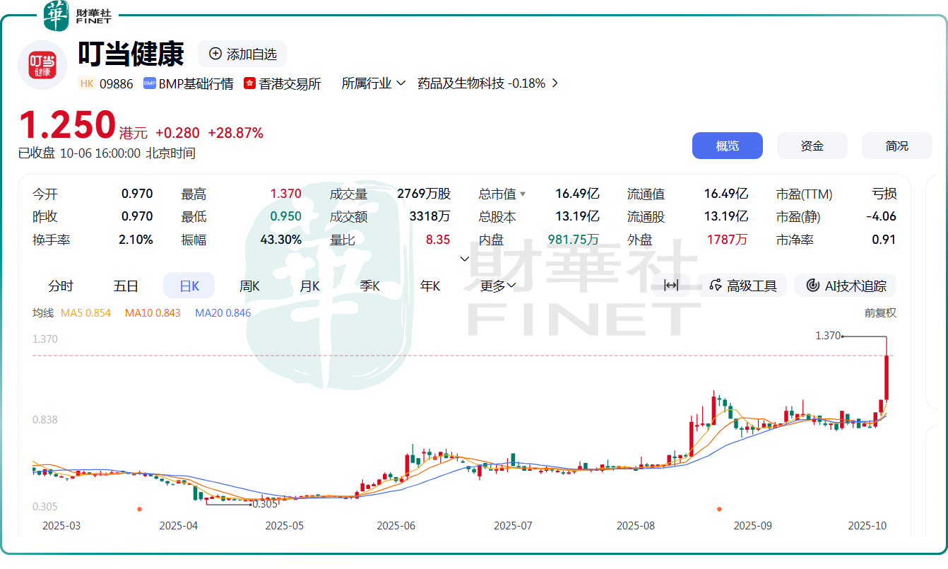 10月6日,叮当健康(09886.HK)股价再度掀起“爆发式行情”,盘中一度涨逾41%。截至收盘,该股涨幅仍达28.87%,报1.25港元/股,近3个交易日里累计涨幅已超56%,成功摆脱“仙股”阵营。